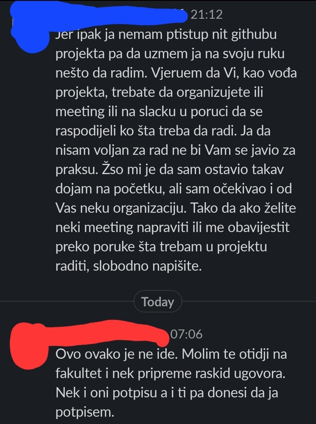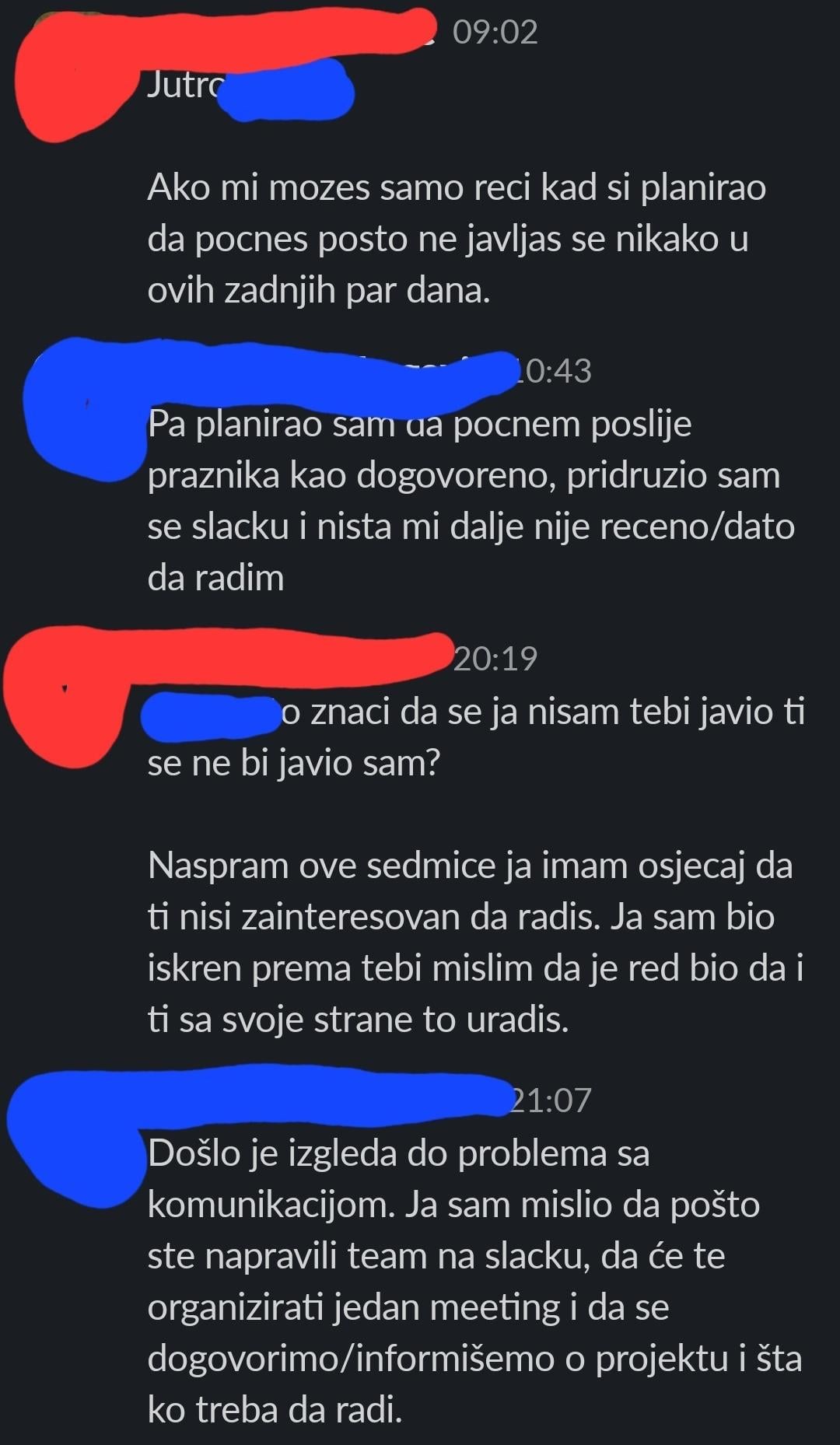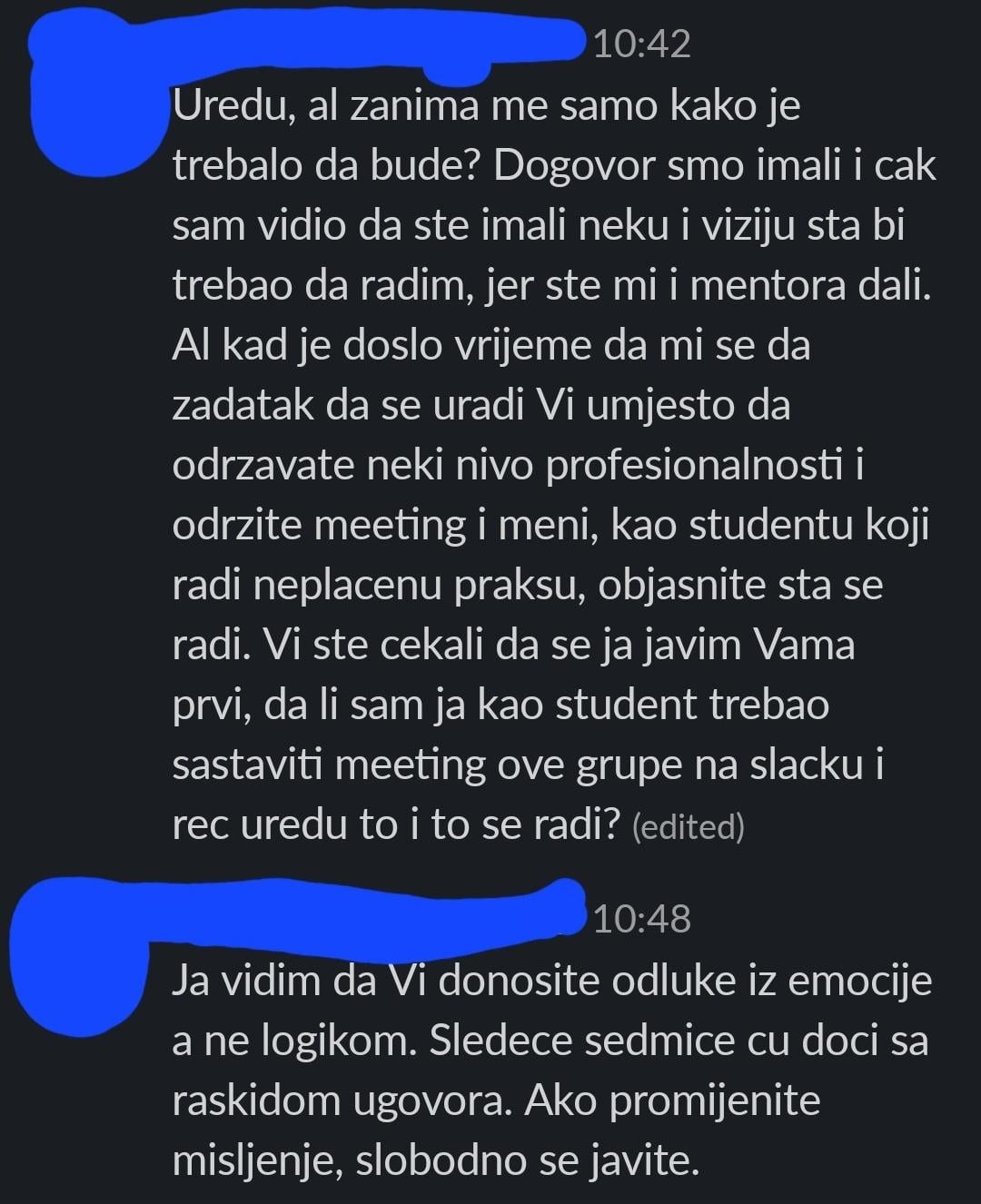 Mogu samo reci svaka cast sa tvoje strane na takvoj komunikaciji i profesionalnosti. Iskreno da su PM-ovi ali i dosta poslodavaca upola tako profesionalni kao sto si ti u ovim screenshotovima, bilo bi sve bolje