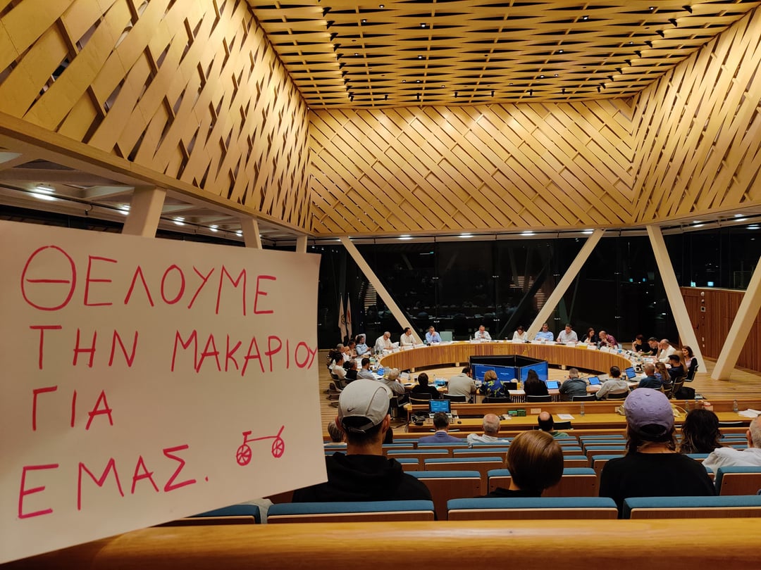 Bild 1: Der Gemeinderat aus der Stimmenzahl von letzten Nächten. Zeichen sagt: "Wir wollen Makariou für uns alle. 🚲"
