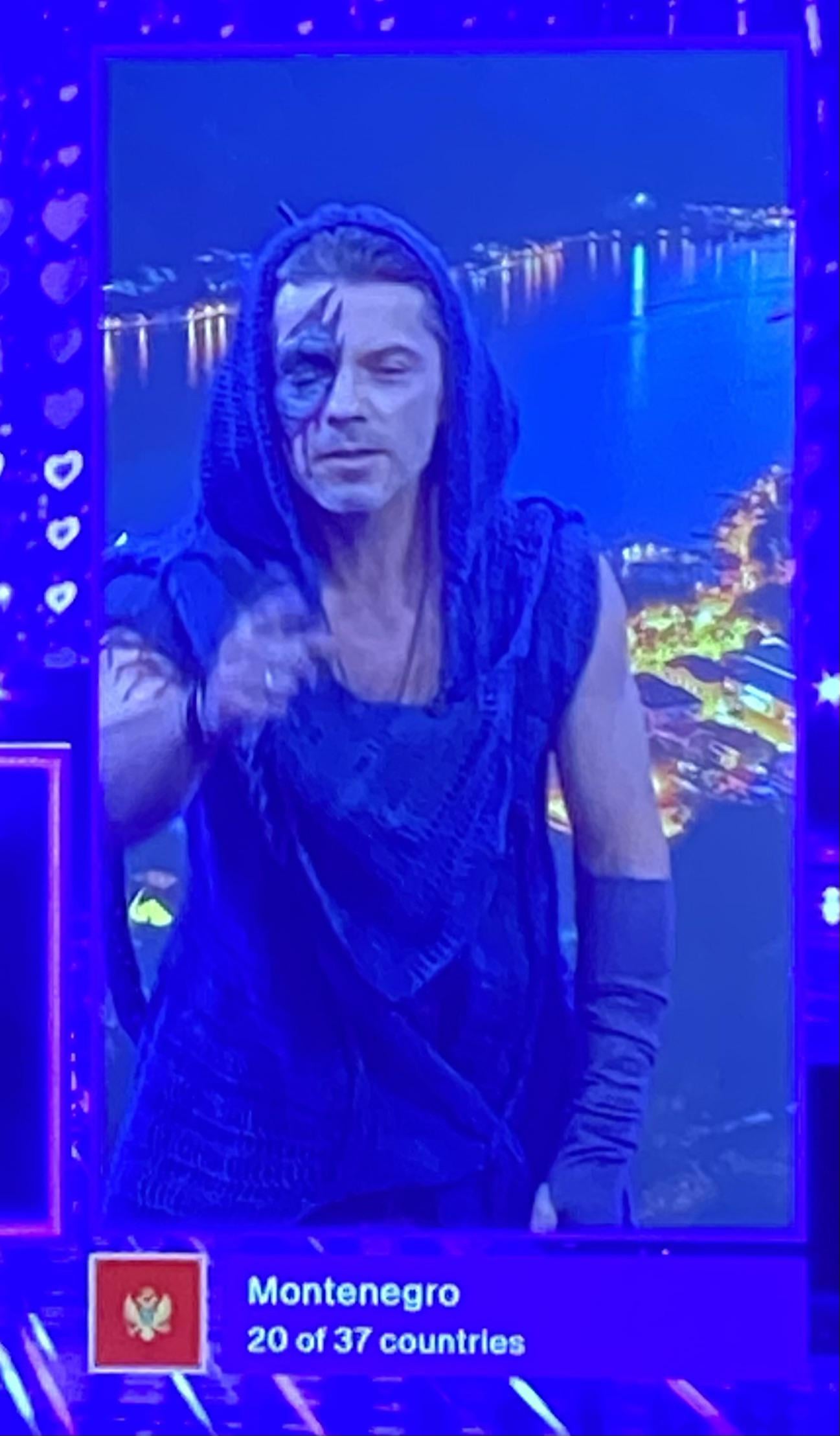 Halo! Ich schaue den europäischen Song Contest (ESC) an und bin neugierig, wer diese Person ist. Sind sie eine berühmte Person in Montenegro? Hält ihre Körperfarbe und ihre Kleidung Bedeutung?