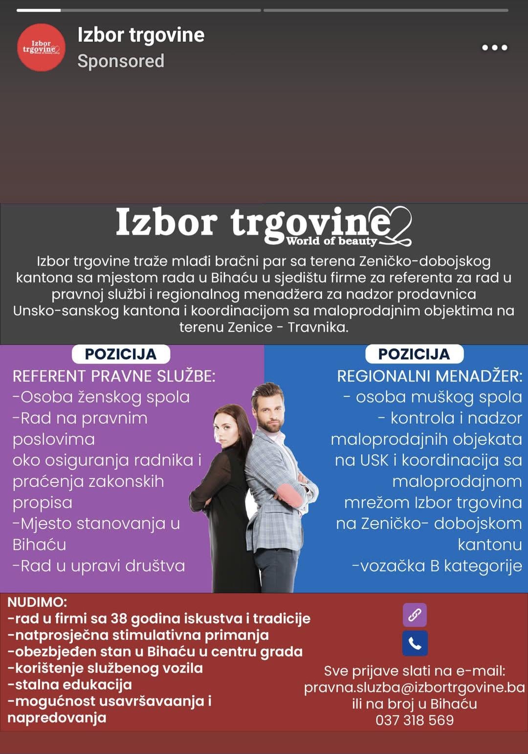 Al bukv je: žena- administrativna radnica, muškarac- komercijalista. Zašto traže nekoga iz Ze-Do ako je navodni stan i stalno radno mjesto u USK