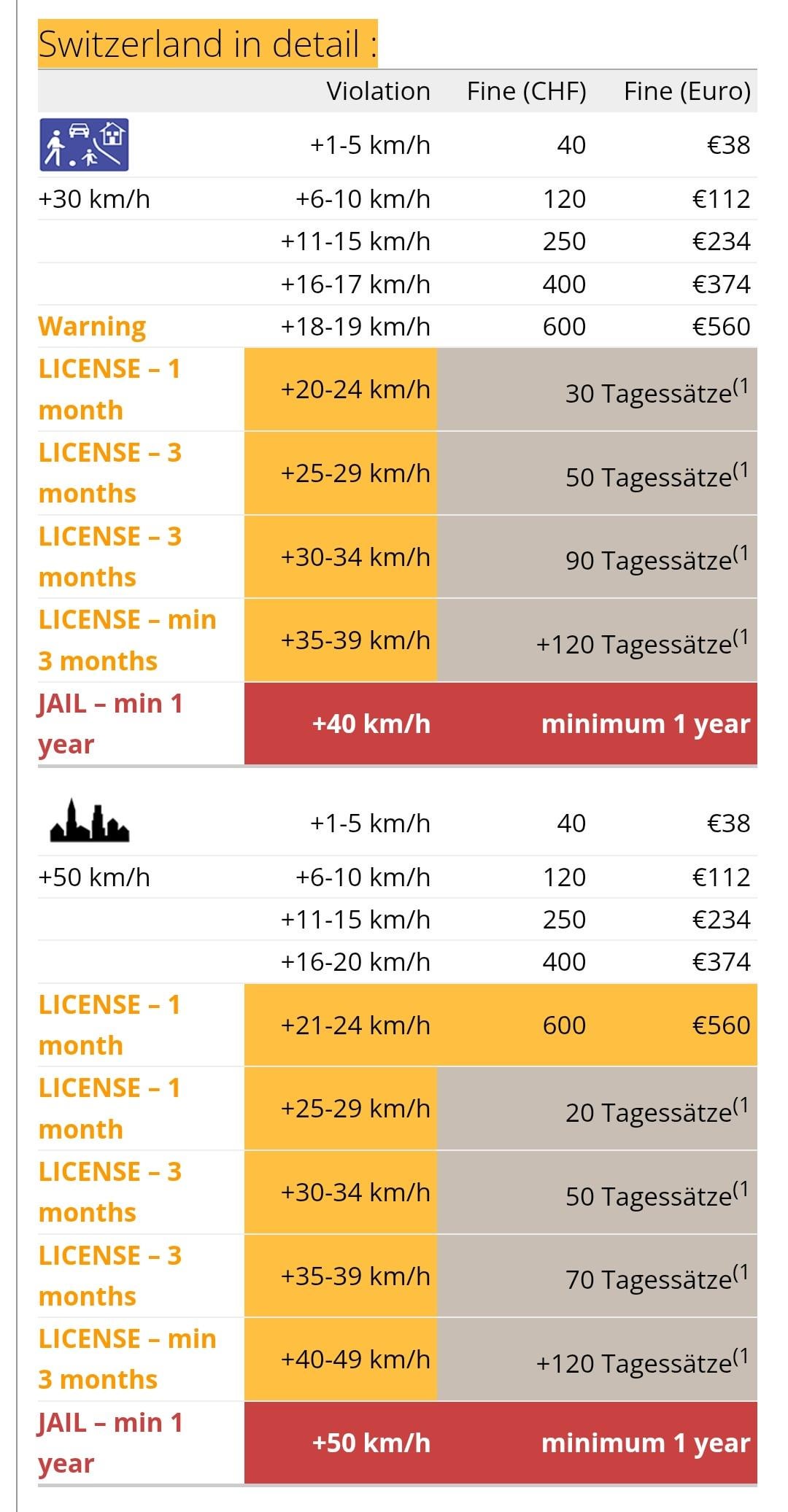 Ich beobachte die Strafen in Europa … die Schweiz bestraft den Prozentsatz pro Einkommen und ist im Allgemeinen strenge Strafen und sogar für Überziehungskräfte der KM / h.