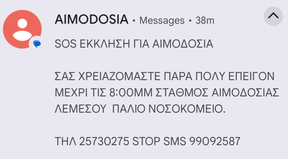 Als jemand, der in der Donor -Datenbank registriert ist, habe ich SMS -Benachrichtigungen von der Limassol -Spendenstation abonniert.