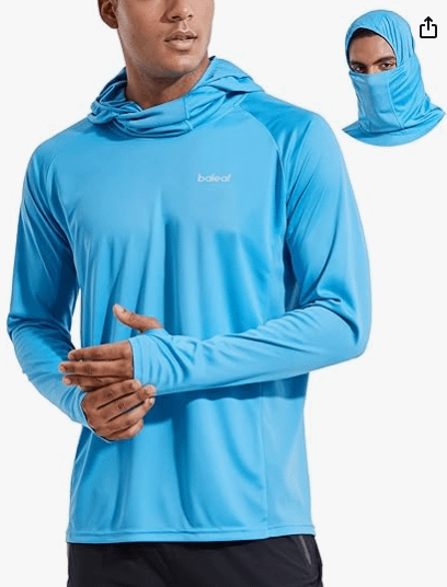 Ich habe vor ein paar Jahren ein paar UV -Schutzhemden von Amazon mit Kapuzen gekauft. Sie sind sehr atmungsaktiv und bequem. (Bild nur als Referenz, meine sind ohne Gesichtsmaske.)