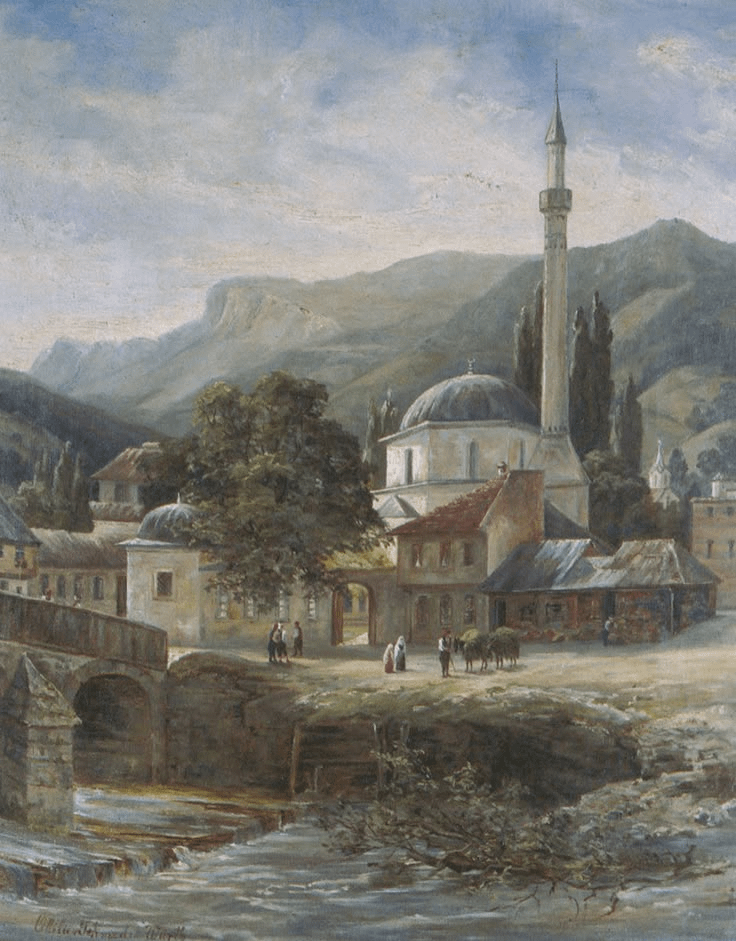 The painting is of Emperor’s Mosque in Sarajevo, but I don’t know the author.