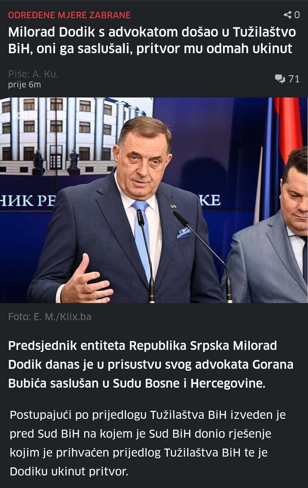 [https://istraga.ba/tajni-pregovori-s-pravosudjem-dodik-dogovara-fiktivnu-predaju-da-bi-mu-bio-ukinut-pritvor-njegov-advokat-ga-izvijestio-da-je-jedna-sutkinja-iz-apelacije-zavrsena/](https://istraga.ba/tajni-pregovori-s-pravosudjem-dodik-dogovara-fiktivnu-predaju-da-bi-mu-bio-ukinut-pritvor-njegov-advokat-ga-izvijestio-da-je-jedna-sutkinja-iz-apelacije-zavrsena/)