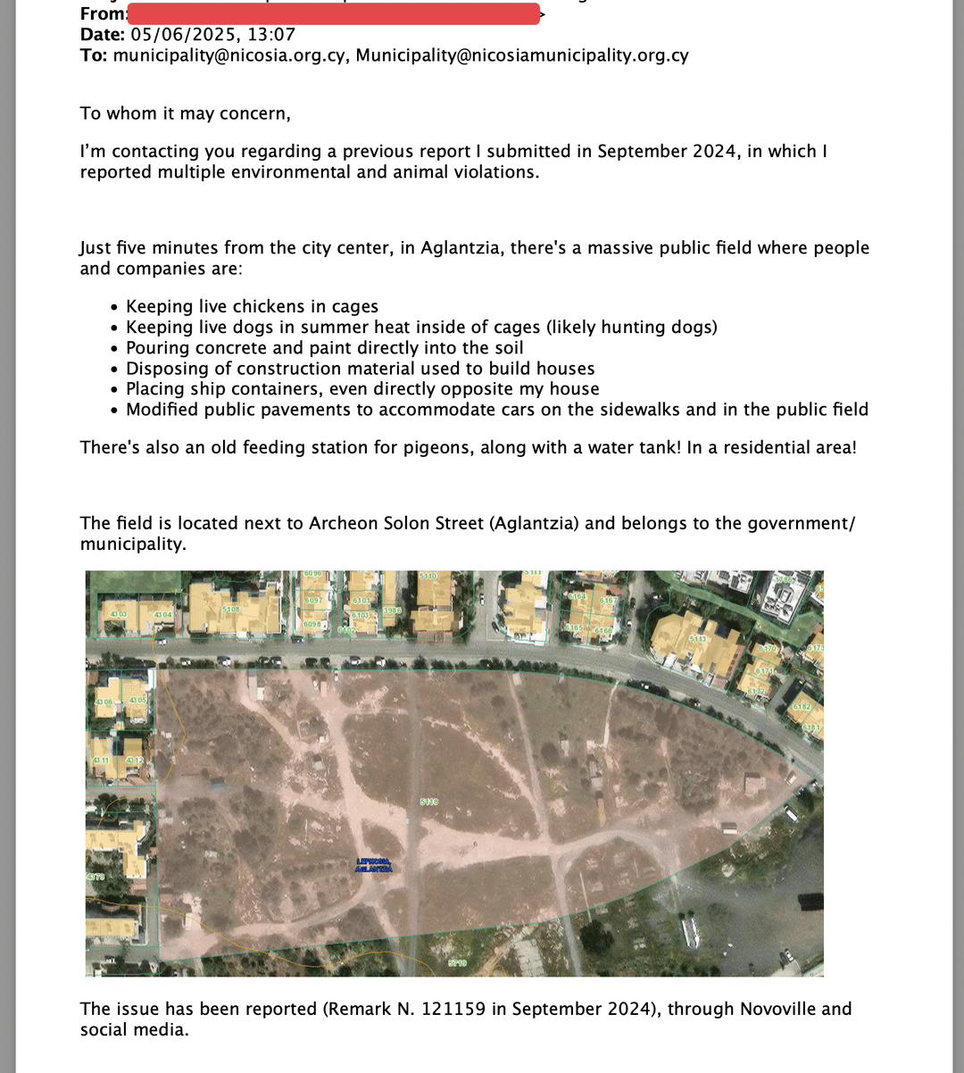 It’s also a good idea to use social media to raise awareness. Tag both the Municipality of Nicosia and the Green Party in your posts to increase visibility and pressure for action.