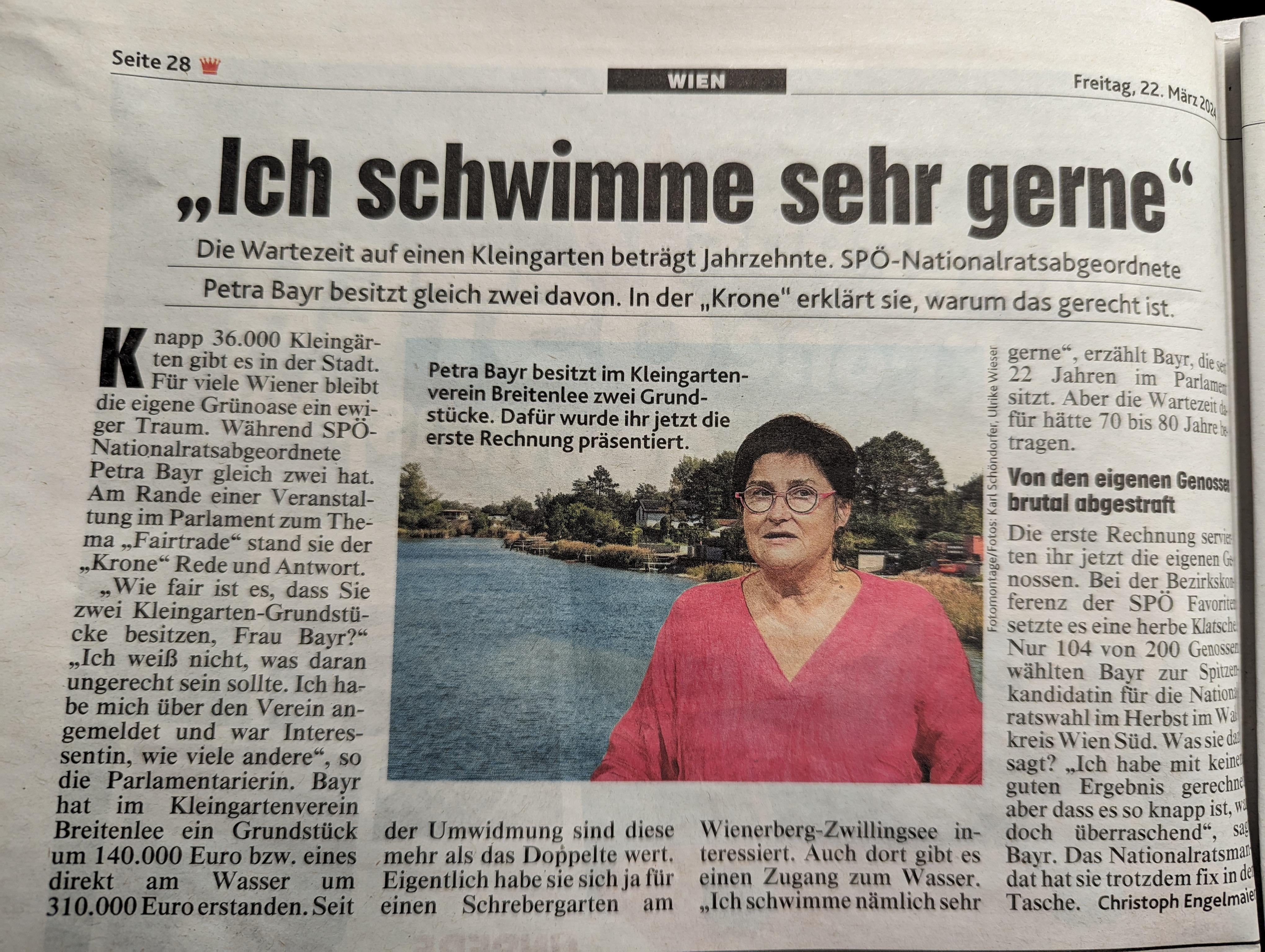 Beeindruckend, dass man 22 Jahre im Parlament sitzen kann und in dieser Zeit nur dann in Erscheinung tritt, wenn man auf sagen wir zweifelhafte Art zu einem Platzerl in einem Kleingartenverein kommt.