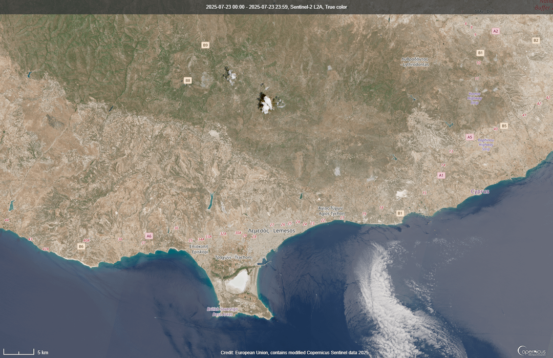 Even more obvious looking at the SWIR layer: https://browser.dataspace.copernicus.eu/?zoom=11&lat=34.80873&lng=32.93873&themeId=DEFAULT-THEME&visualizationUrl=U2FsdGVkX195UCCeDSNVTwVVsr9hyh3gWjwgeverIYMBA1C%2Fo0Wt6nLm0ymbDsztlIn8KoYuWMH1GlV52ZUxDx4Rd0KvyucyYsdaBphlv54YodB39qWWHpCRzUyP4CeY&datasetId=S2_L2A_CDAS&fromTime=2025-07-26T00%3A00%3A00.000Z&toTime=2025-07-26T23%3A59%3A59.999Z&layerId=6-SWIR&demSource3D=%22MAPZEN%22&cloudCoverage=30&dateMode=SINGLE.
