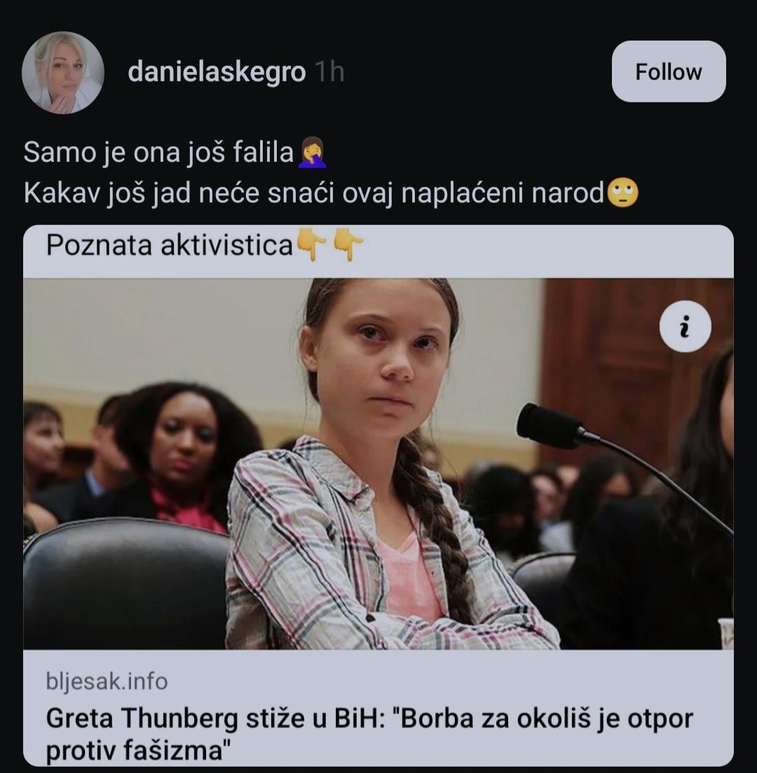 Ti danijelaskegro si samo mi nedostajala. Ko tebe i tvoje mišljenje jebe, prosto rečeno. Greta ima vrijednosti, djev. se bori protiv idiota/raskoša poput tebe samo je u gubitku jer previše je smrada izašlo iz kanalizacije na ulicu. Poput žaba ste koje se lagano kuhaju dok ne shvati te da ste za večeru. Polahko i vaše će vrijeme doći. Srce koliko si glupa već boli, vođa simpletona.