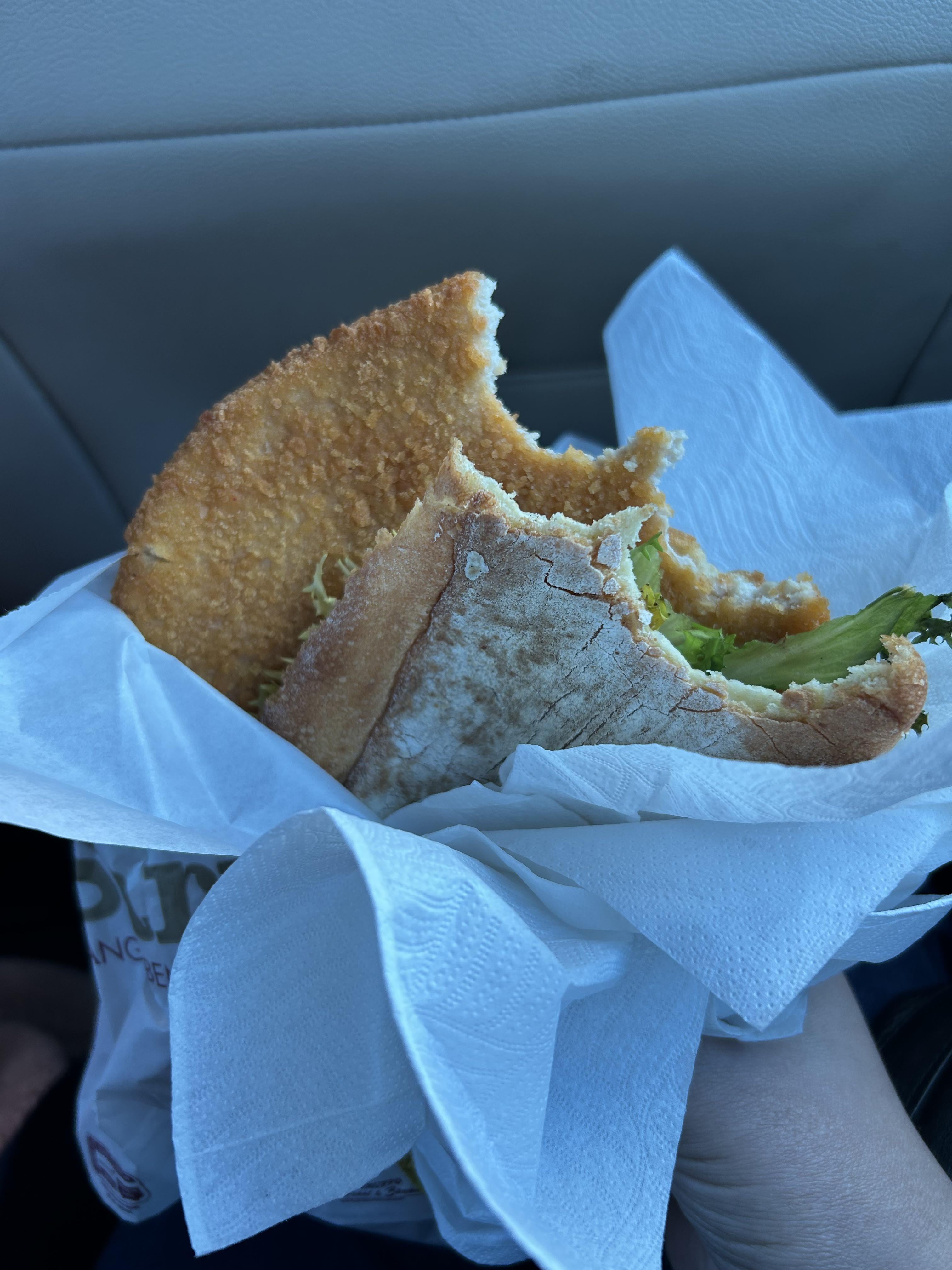 It’s a basic „filone“ bread with a chicken cutlet in it, a light smear of mayo and a leaf of lettuce. You basically love the default bar/gas station sandwich here in Italy