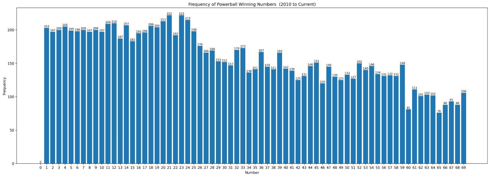 It’s worth noting that the range of potential numbers for Powerball (both for the main numbers and for the Powerball) have changed over the years which is why the graph isn’t as even as one might expect.