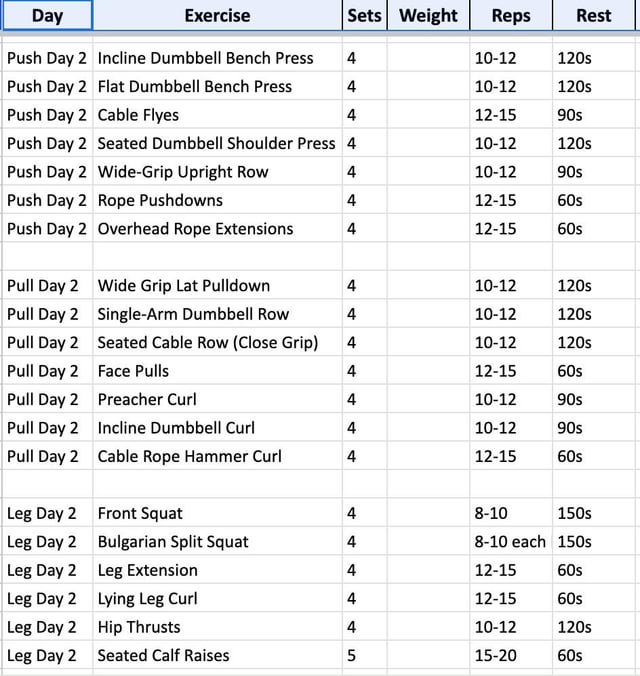 Die ersten drei Tage sind mit größerem Gewicht und einer geringeren Wiederholung, und die anderen drei Tage sollten für Hypertrophie dienen.