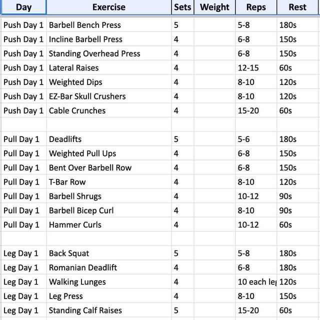 3x tjedno,1 dan prsa i triceps, drugi dan leđa i biceps, treći dan ramena i noge. Na kraju svakog treninga trbušnjaci. Sve iz glave. Ovo planiranje,crtanje dijagrama i piskaranje po aplikacijama mi je gubljenje vremena.