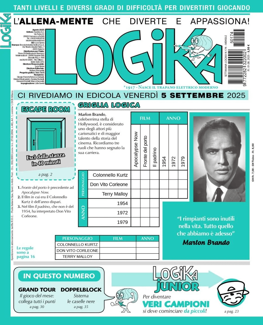 Inzwischen müde ich den üblichen Cruciverba und das klassische Puzzle, entschloss ich mich, ein neues Magazin, die Logika -Woche, zu abonnieren, und es war eine Entdeckung! Es besteht aus verschiedenen Spielen, hauptsächlich mit Zahlen und jeder hat logische Argumente gemeinsam. In jeder Veröffentlichung gibt es zwei spezielle Spiele (zum Beispiel Fluchtraum), die sich ändern und zurückkehren. Die letzte Seite ist auch den Rätsel gewidmet, um in einer Gruppe gelöst zu werden, sie sind sehr nett und sind dem lateralen Denken gewidmet! Ich wollte daher meinen Eindruck zurückbringen, weil es eine Zeitschrift ist, die kaum in Zeitungskiosk und monatlich zu finden ist (auch wenn sie die Logika -Woche monatlich herausstellt). Vielleicht können andere Enthusiasten von Rätsel und Logik nützlich sein und es wird erfreut sein, mich zu mögen! Und was denkst du? Hat jemand sie schon gekannt? Welches Puzzle machst du?