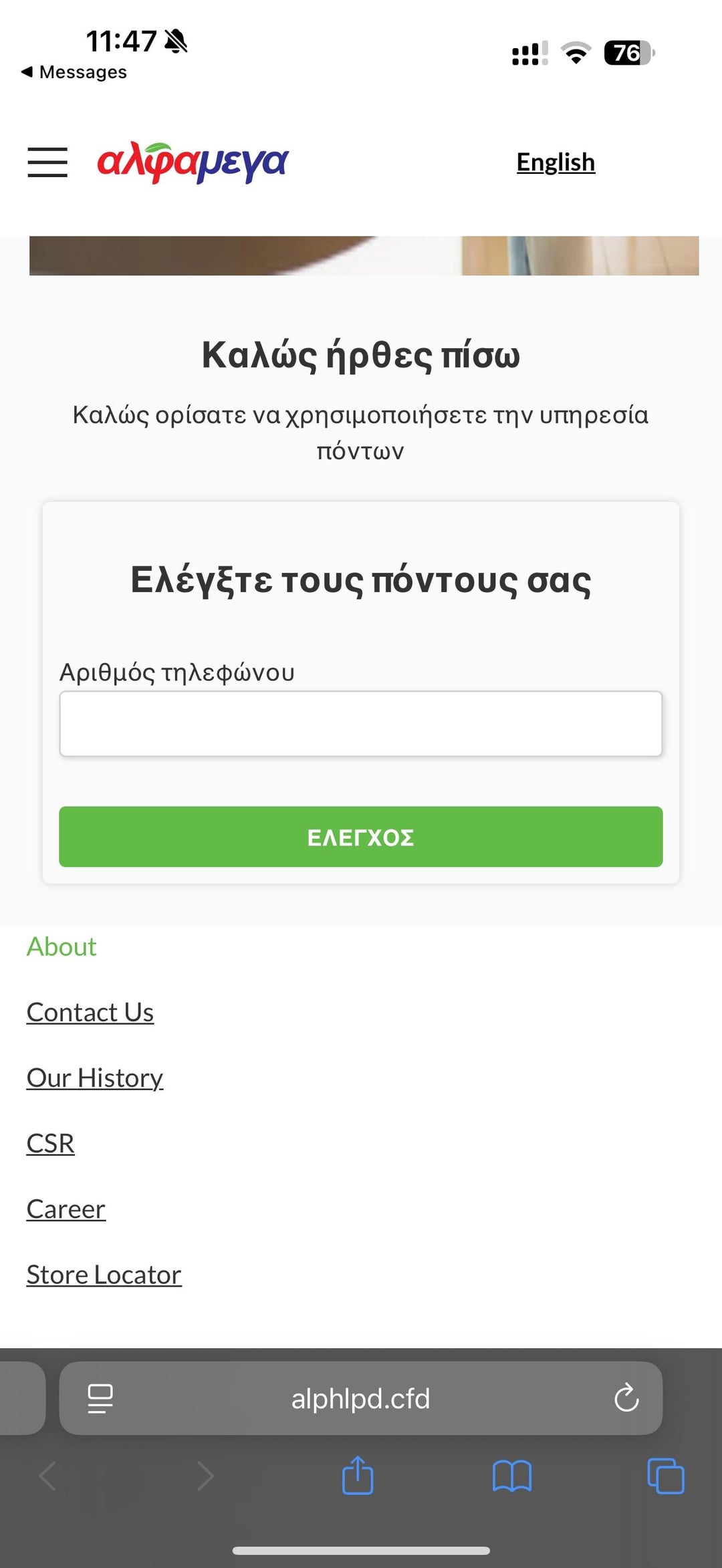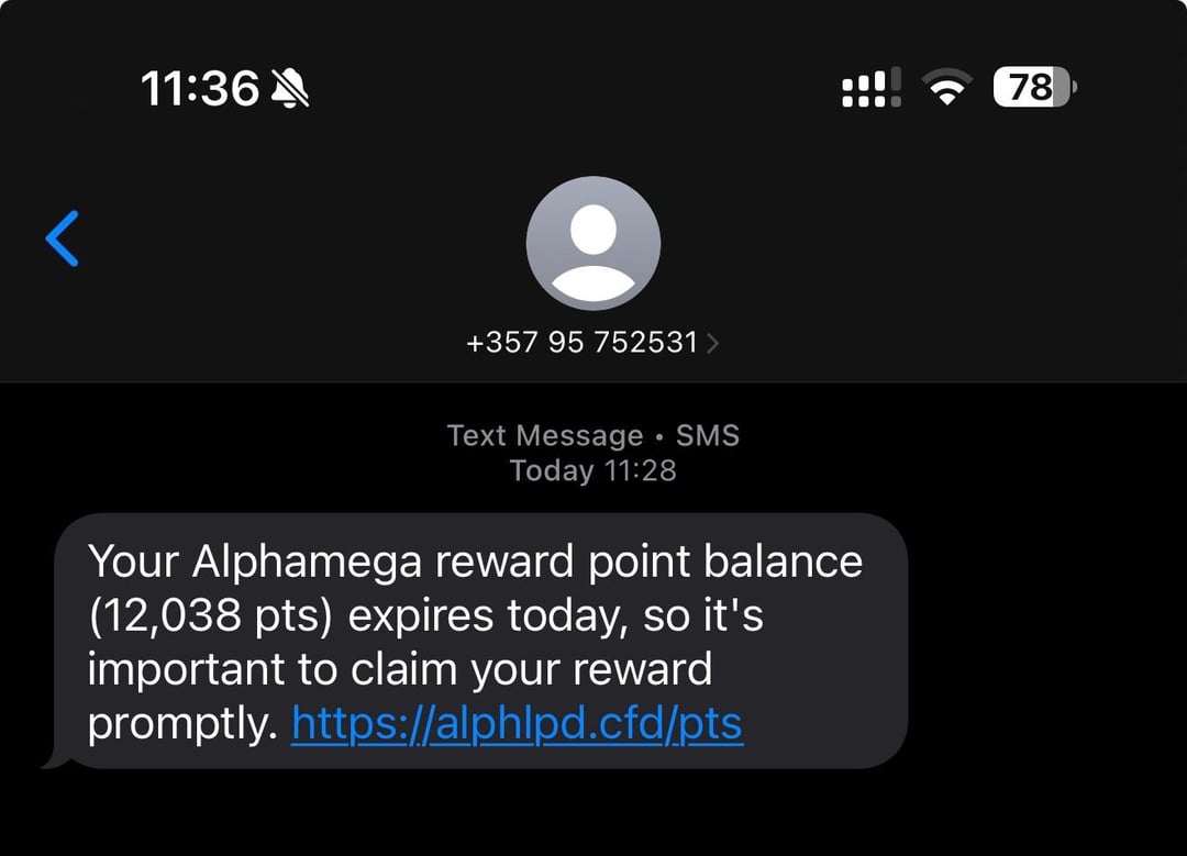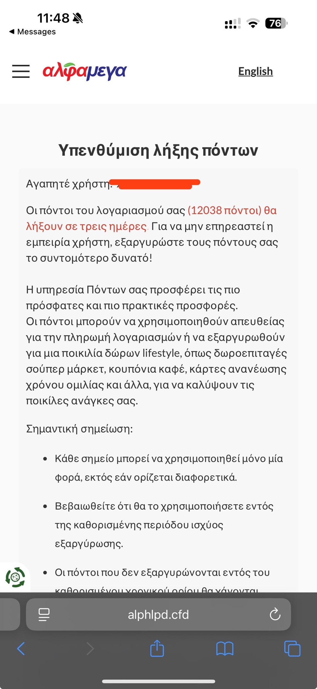 Erhielt einen Text von Alphamega, bringt Sie zu einer Seite, auf der Ihre Punkte abläuft, und um sie in Amazon- oder Apple -Geschenkkarten zuzüglich 2 € Liefergebühr umzuwandeln.