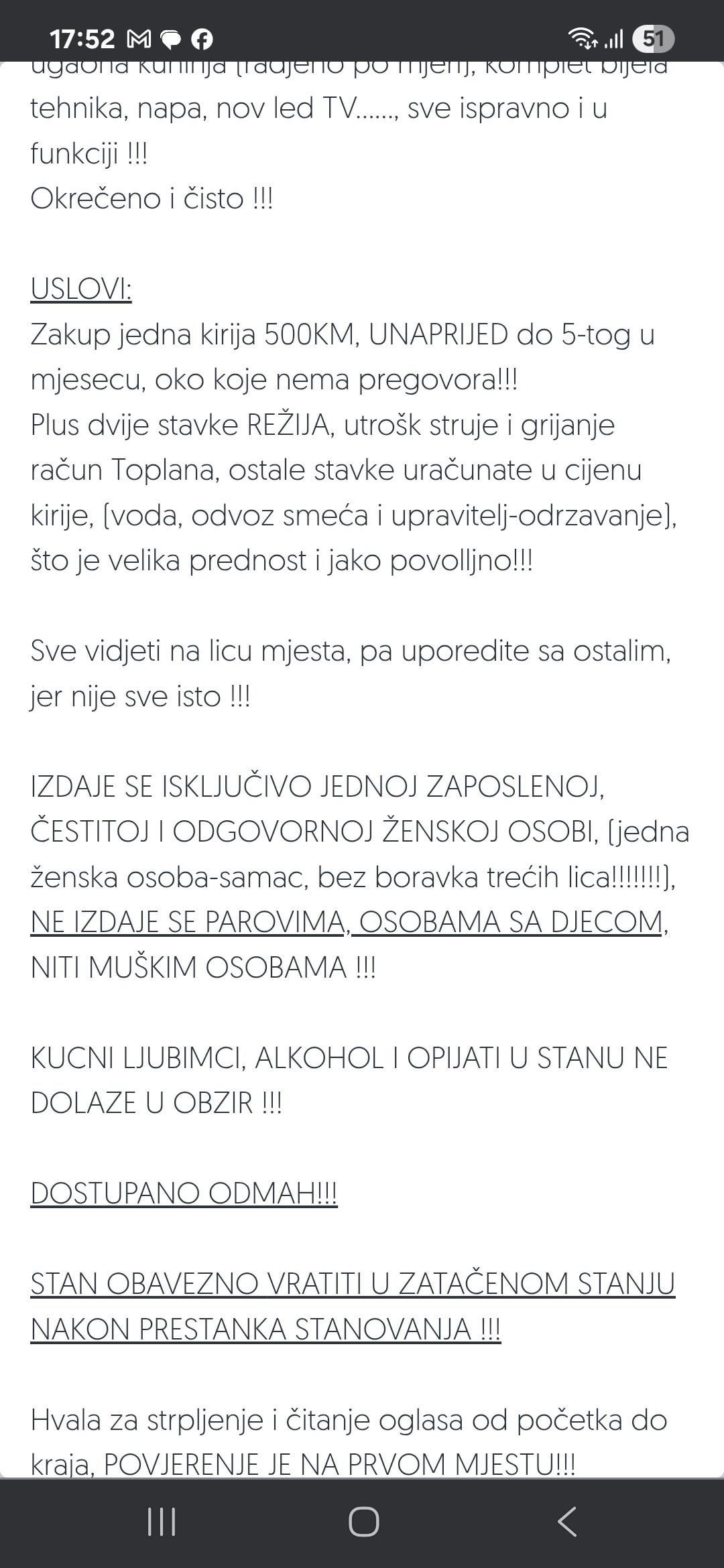Ova velika slova i uzvicnici mi nervozu izazivaju. Kao da prijeti, a ne trazi nekoga za iznajmiti stan