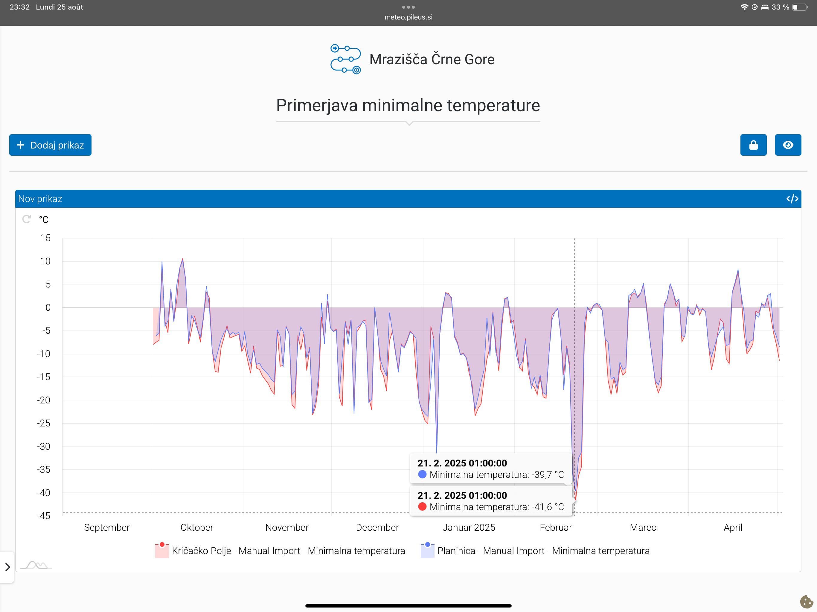 Share Facebook Twitter LinkedIn Pinterest Bluesky Threads Die niedrigste gemessene Temperatur in Montenegro wurde in diesem Winter auf dem Sinjavina -Plateau gemessen. Am 20. Februar haben wir -41,6 C gemessen. https://i.redd.it/pst7895d0blf1.jpeg Von Locus-Iste