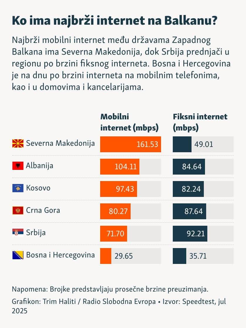 Laut SpeedTest.net vom Januar 2025 wurde die Reihenfolge der Balkanstaaten durch Mediano festgelegtes Breitband -Internet (Download MBPS):