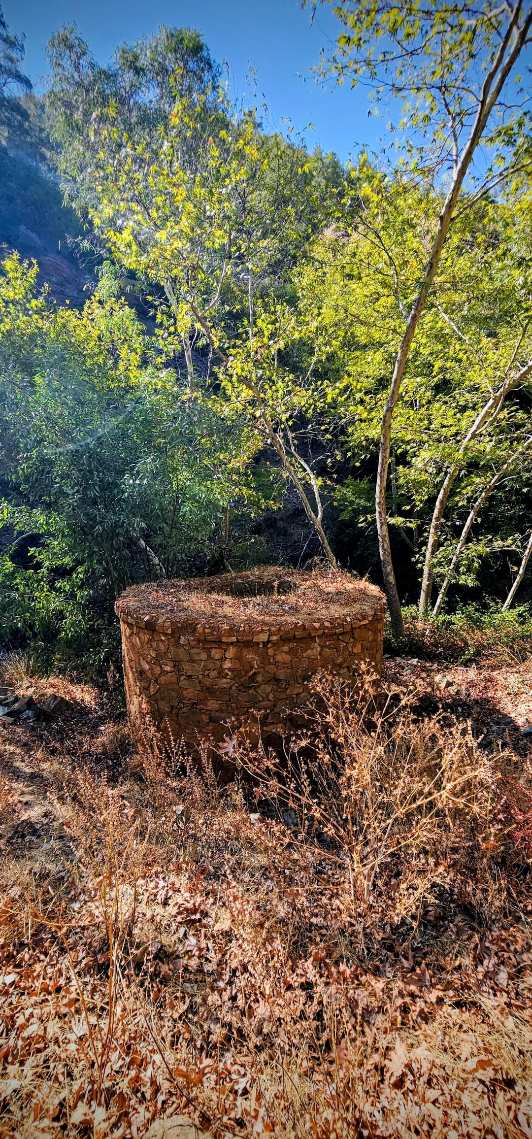 The circular stone build is a handmade well, perhaps to collect rainwater or the water from a nearby stream as you signaled, the nearer to a running stream, there is less need to dig deep into the earth.