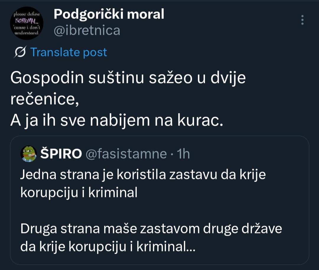Iskreno me boli qrac. Preselio sam se u drzavu do, posjecujem svoje samo za praznike i kad imam odmor… Jedan od razloga je bilo to nacionalno previranje. Srbin Crnogorac Albanac Bosnak kurac palac. Izdajnik , nije izdajnik, crkva okupirana nije okupirana. 1918 , 2020. Prekurcilo mi vise. Stvaraju se getoi ko da je Brazil..