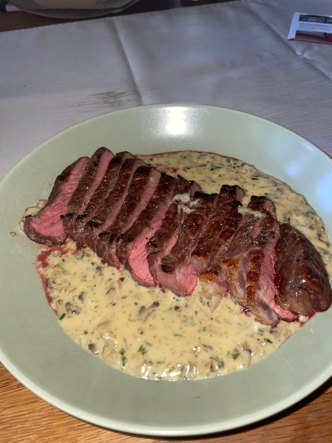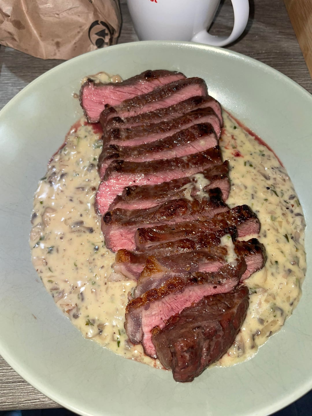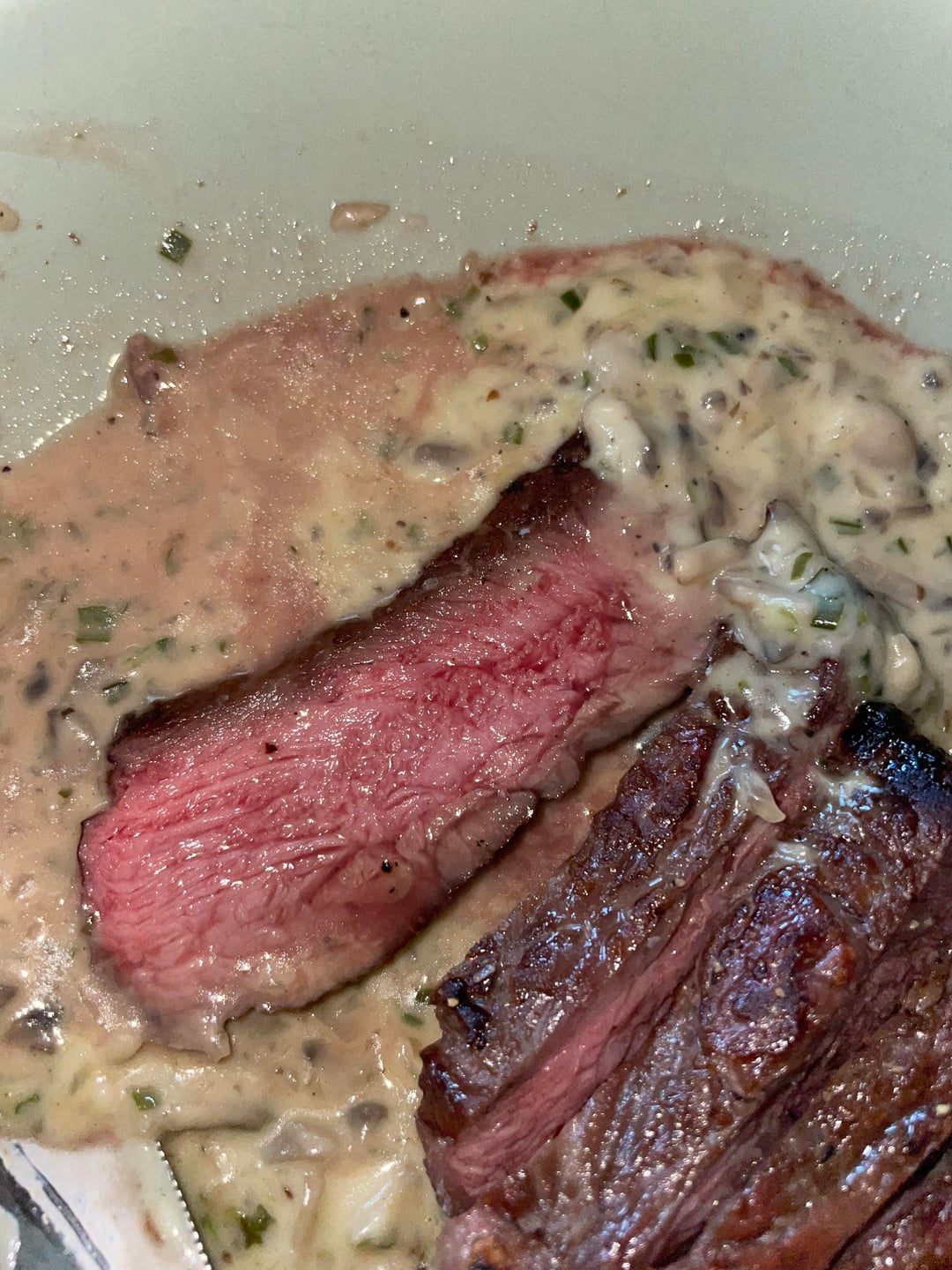 Ich habe das Steak per Reverse Sear zubereitet, hätte für meinen Geschmack ein bisschen weniger durch seien können, bin aber zufrieden für das erste Mal mit der Technik. Für die Sauce hab ich Champignons und Zwiebeln angeschwitzt und mit Butter, schwarzem Pfeffer, Gemüsebrühe und Sahne verarbeitet.