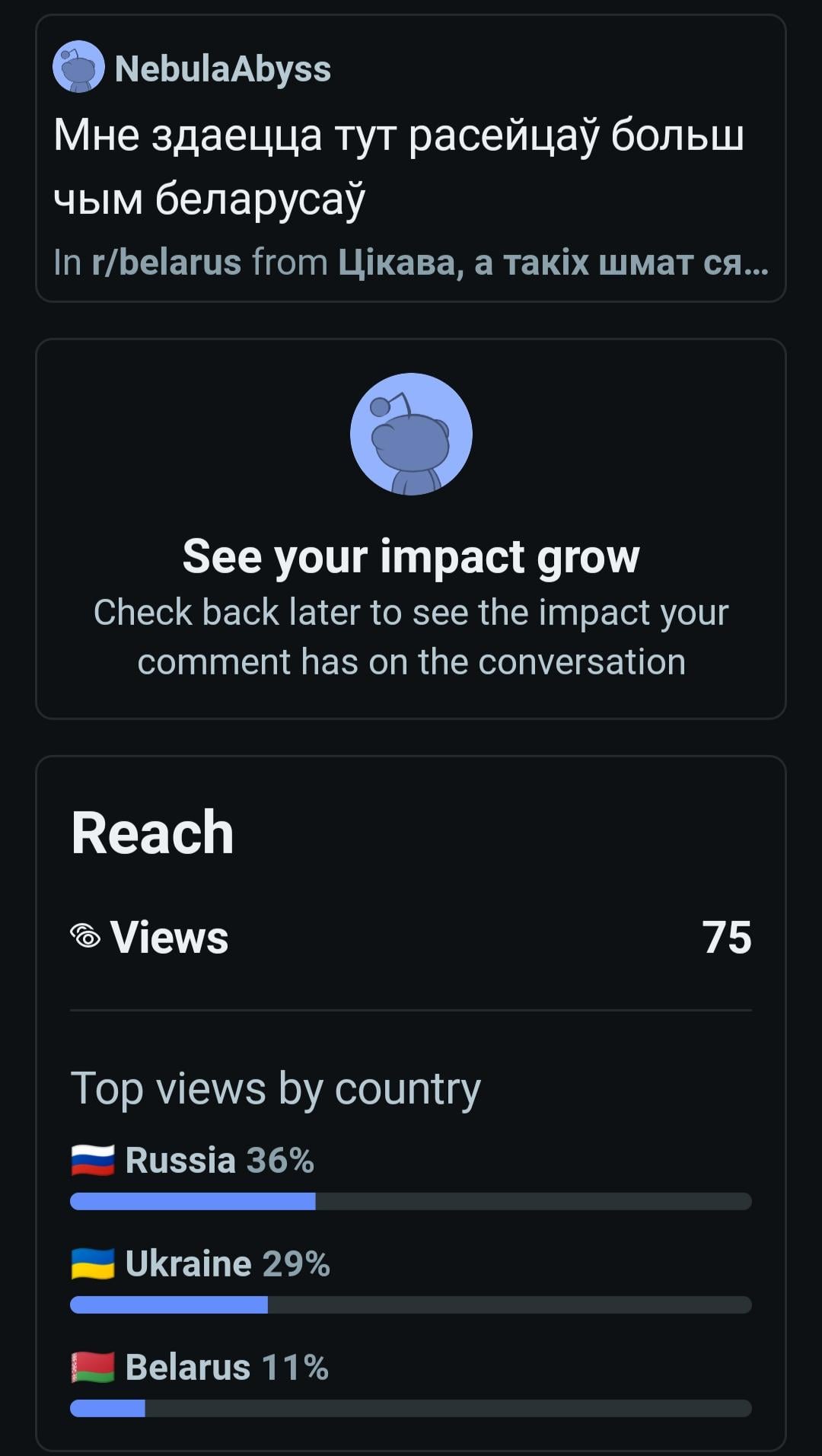 6. Шмат праглядаў з іншых краін, бо Рэдыт паказвае ім нашы допісы. Але ж замежнікі не так часта бяруць удзел у гутарцы.