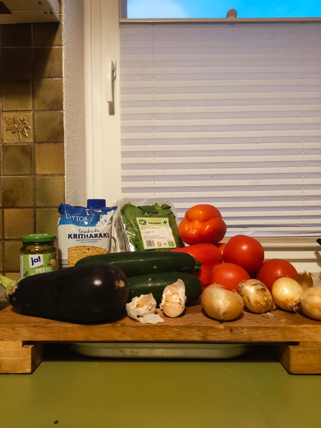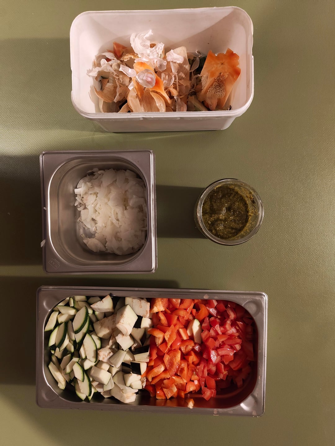 – Paprika(668 g), Aubergine(325 g), Zucchini(721 g), Zwiebeln(228 g) und Tomaten(599 g) grob würfeln
