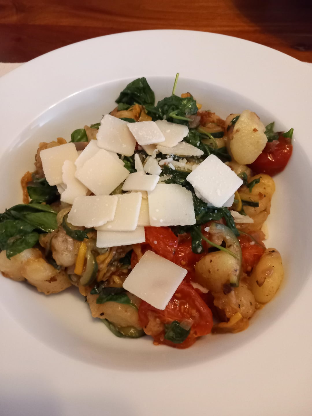 Salz, Pfeffer aus der Mühle, jeweils ca 1 EL Thymian, Rosmarin und Majoran mit rein, halbierte Tomaten dazu, nur kurz zum warm werden, Gnocchi dazu, die mittlerweile in eine feste Masse in Form der Schüssel hatten, versuchen die auseinanderzudrücken, mischen, den Spinat oben drauf, zum weich werden lassen, Deckel drauf. Der pfanneninhalt war zu dem Zeitpunkt doppelt so hoch als die Pfanne. Den Spinat dann so langsam untergehoben, den Speck derweil klein gehackt, drauf, Foto machen, auf Teller schübeln und Parmesansplitter drauf.