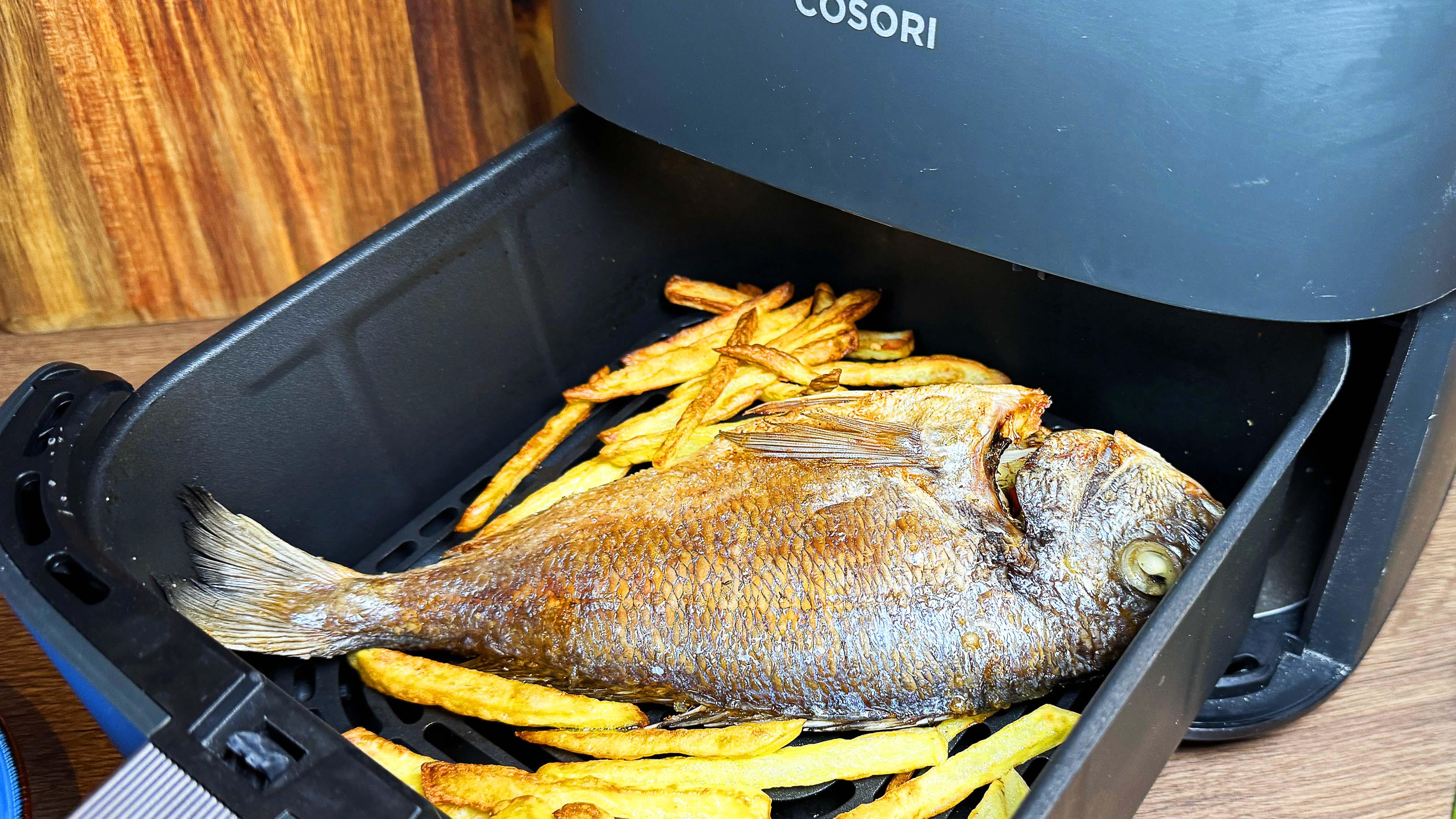 5. **Kochen:** Fisch und Pommes in die Heißluftfritteuse geben. Auf 180 °C für 20 Minuten einstellen.