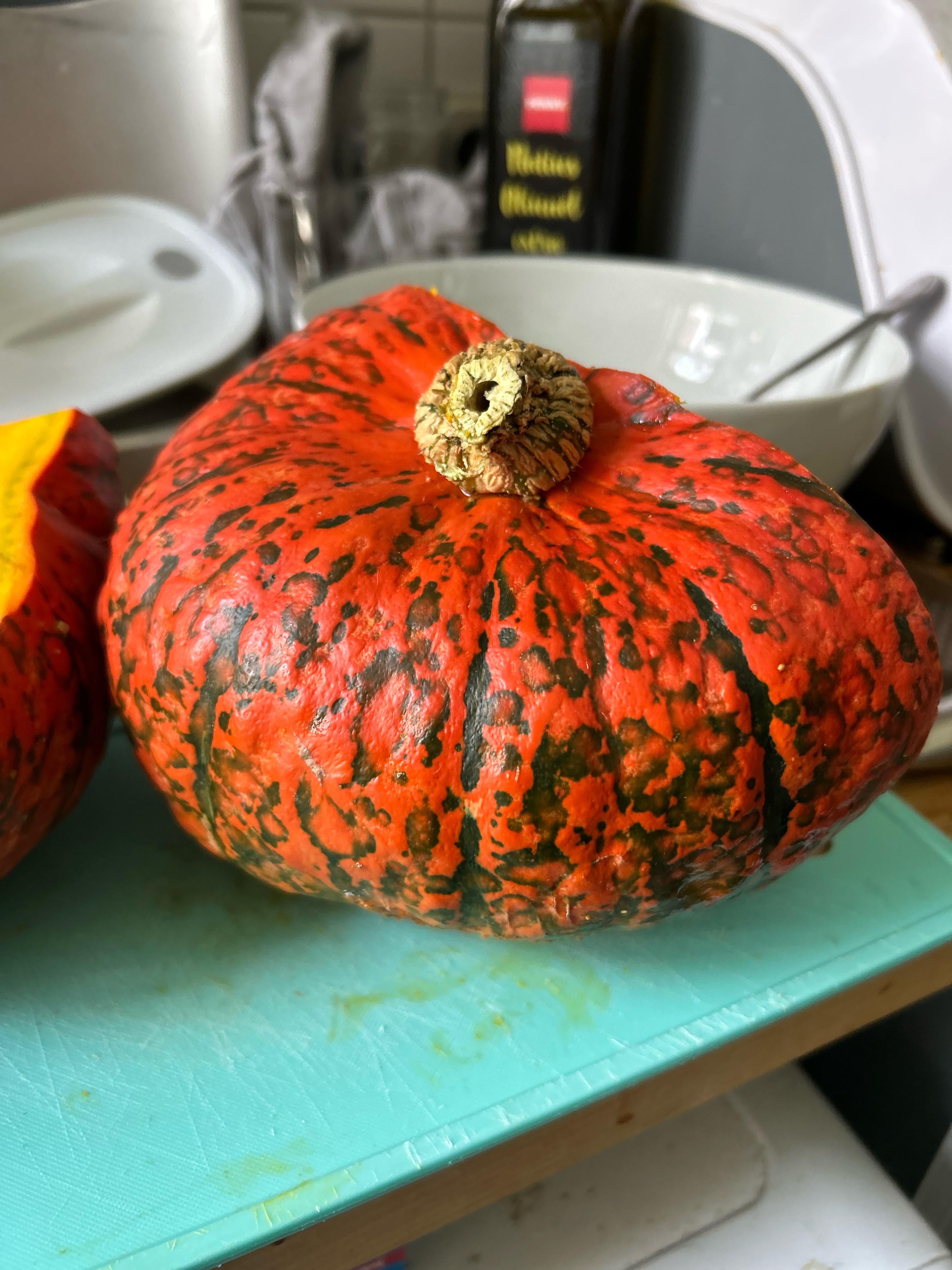 Sieht genau so aus wie die Hokkaido’s mit denen ich gestern ne Suppe gemacht hab. Das Grüne kommt davon dass er noch nicht ganz durchgereift ist, aber solange es nur auf außen auf der Schale ist es kein Problem.