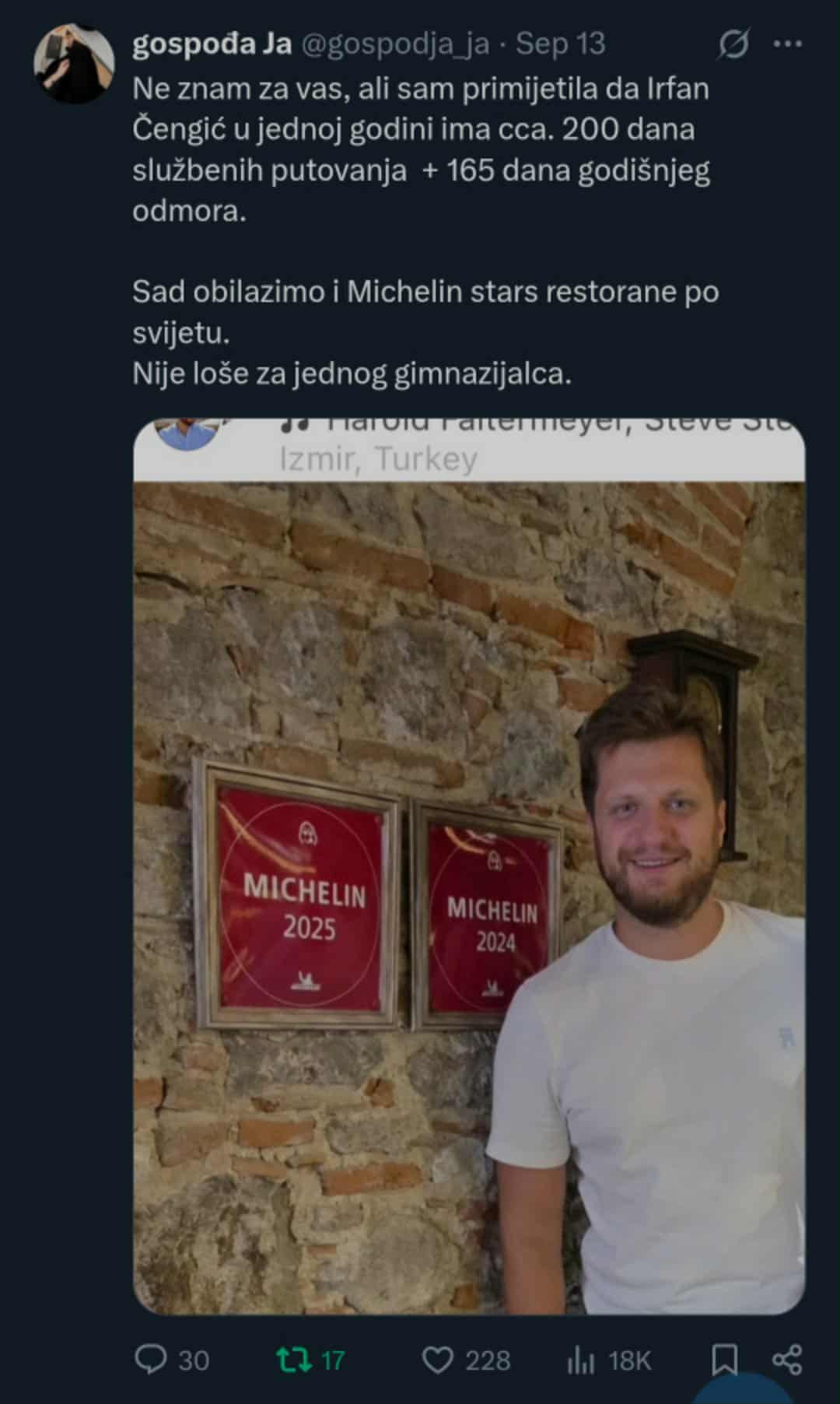 Helem, ima Irfan Čengić milion aferima, ali ovo brojanje para nekome mi je baš degutantno. Lik putuje, što radi 85% naroda ovdje, ne voza se helikopterima niti se slika iz Dubaija iz hotela sa sedam zvjezdica, de se dozovite.