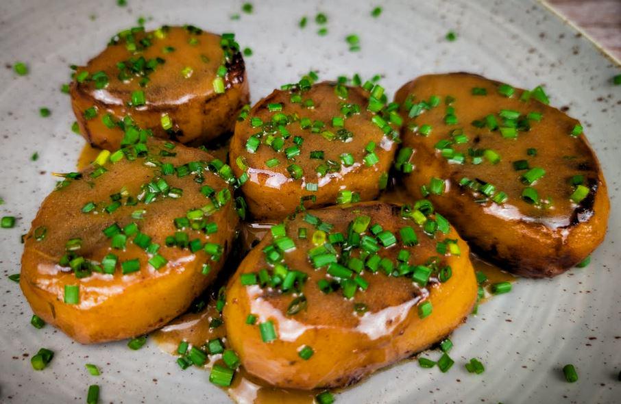 (4) Rinderbrühe aufgießen, bis die Kartoffeln zu drei Viertel bedeckt sind. Abdecken und im vorgeheizten Ofen bei 180 °C für 45 Minuten backen. Dabei regelmäßig die Kartoffeln mit der Sauce begießen.