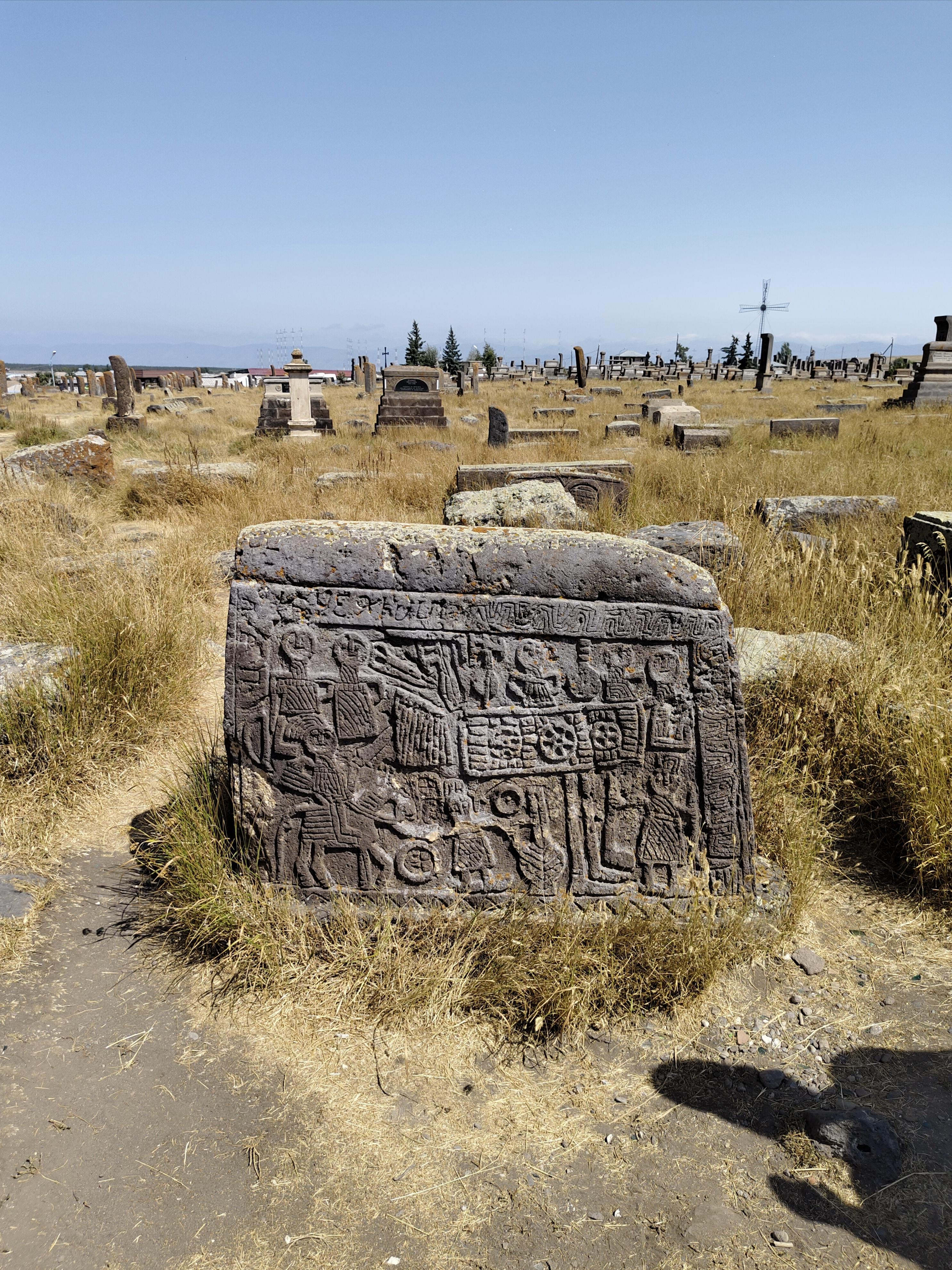 Der Grabstein einer Braut und eines Bräutigams wurde zusammen mit all ihren Gästen bei ihrer Hochzeit ermordet. Die hier dargestellte Szene ist ihre Hochzeit. Noratus Cemetery, Armenien.