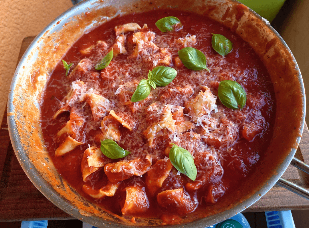 Tomatensoße abschmecken, Tortellini rein und 5 Minuten köcheln lassen.