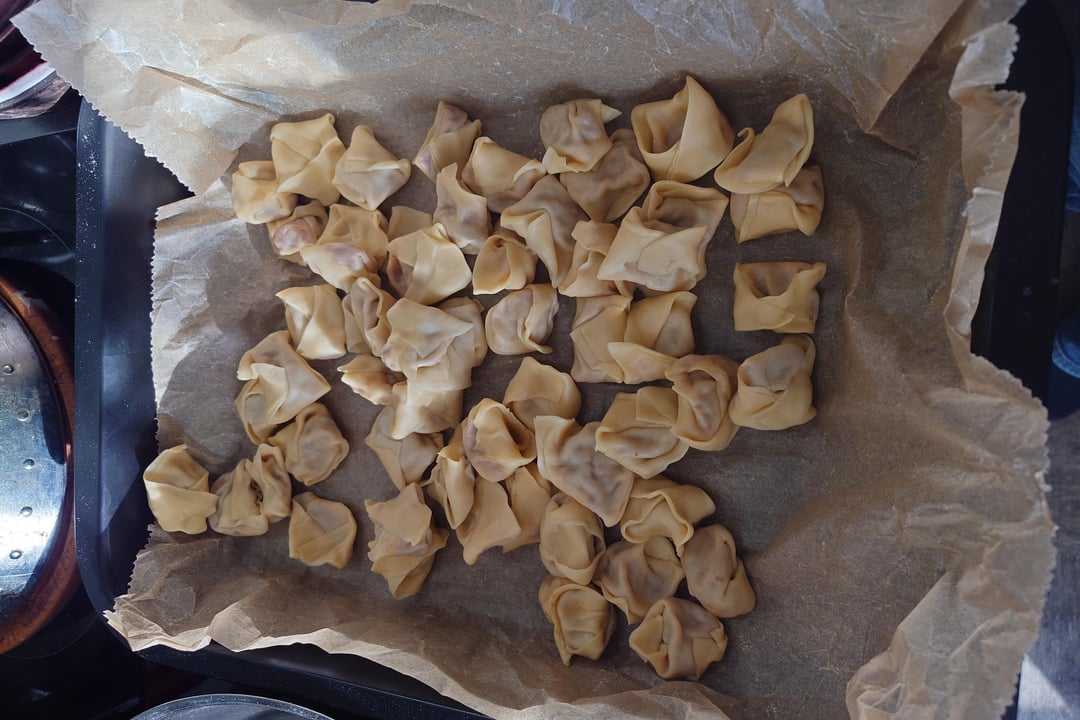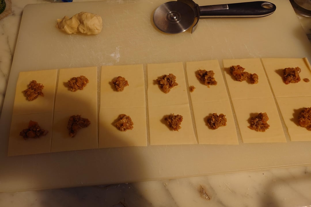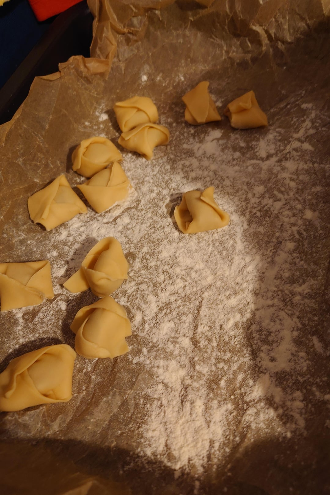 Dann mit einer Nudelmaschine bis auf die vorletzte Stufe Ausrollen (bei mir 6/7) und in Quadrate schneiden, mit einem 1/3 Teelöffel befüllen und zu Tortellini formen. Genaue Anleitungen dafür gerne auf Youtube suchen. Ü