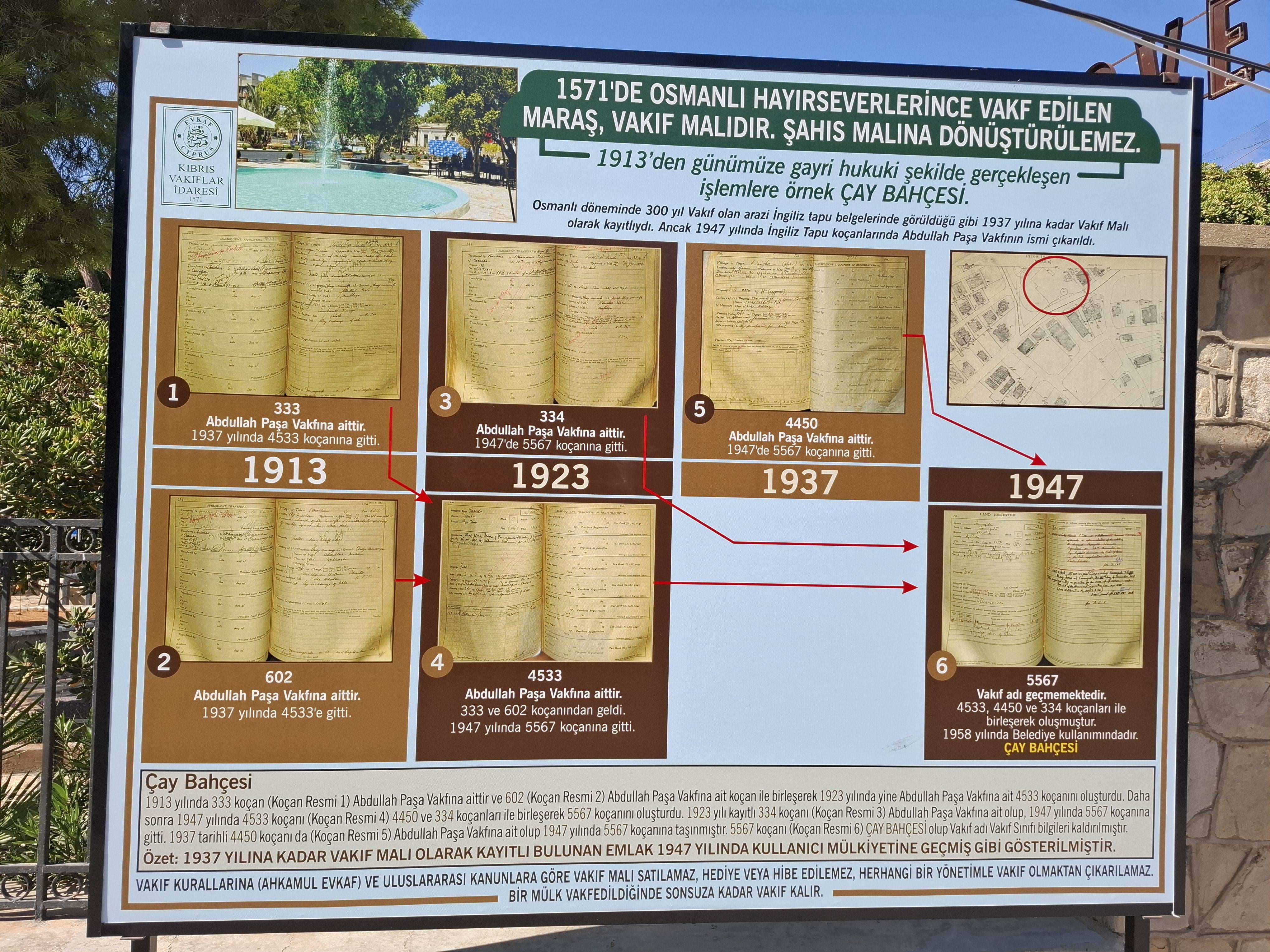 This sign is showing proof that the **Tea Garden in Maraş was originally charity foundation land**, but it was **illegally converted into private property in 1947**.