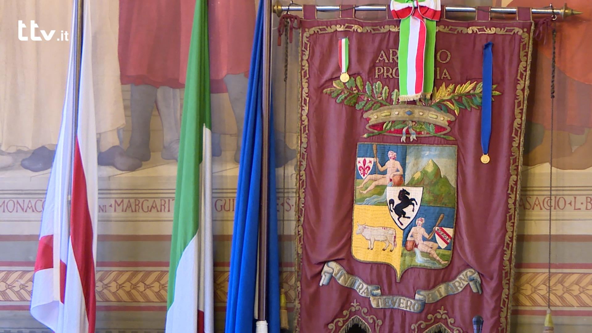 Auf dem Foto: Das Banner der Provinz Arezzo, dekoriert mit Goldmedaille für militärische Tapferkeit.