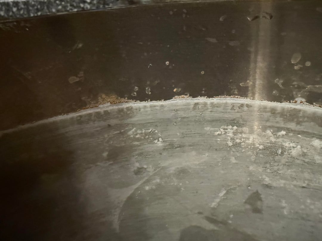 Habe dann also wieder heißes Wasser hineingetan und etwas Essig zum einweichen. Leider musste ich dann zu einer Verabredung und die Pfanne blieb dann erstmal paar Stunden stehen und hab das nun so vorgefunden nachdem ich die Pfanne ausgespült habe 😂🫡