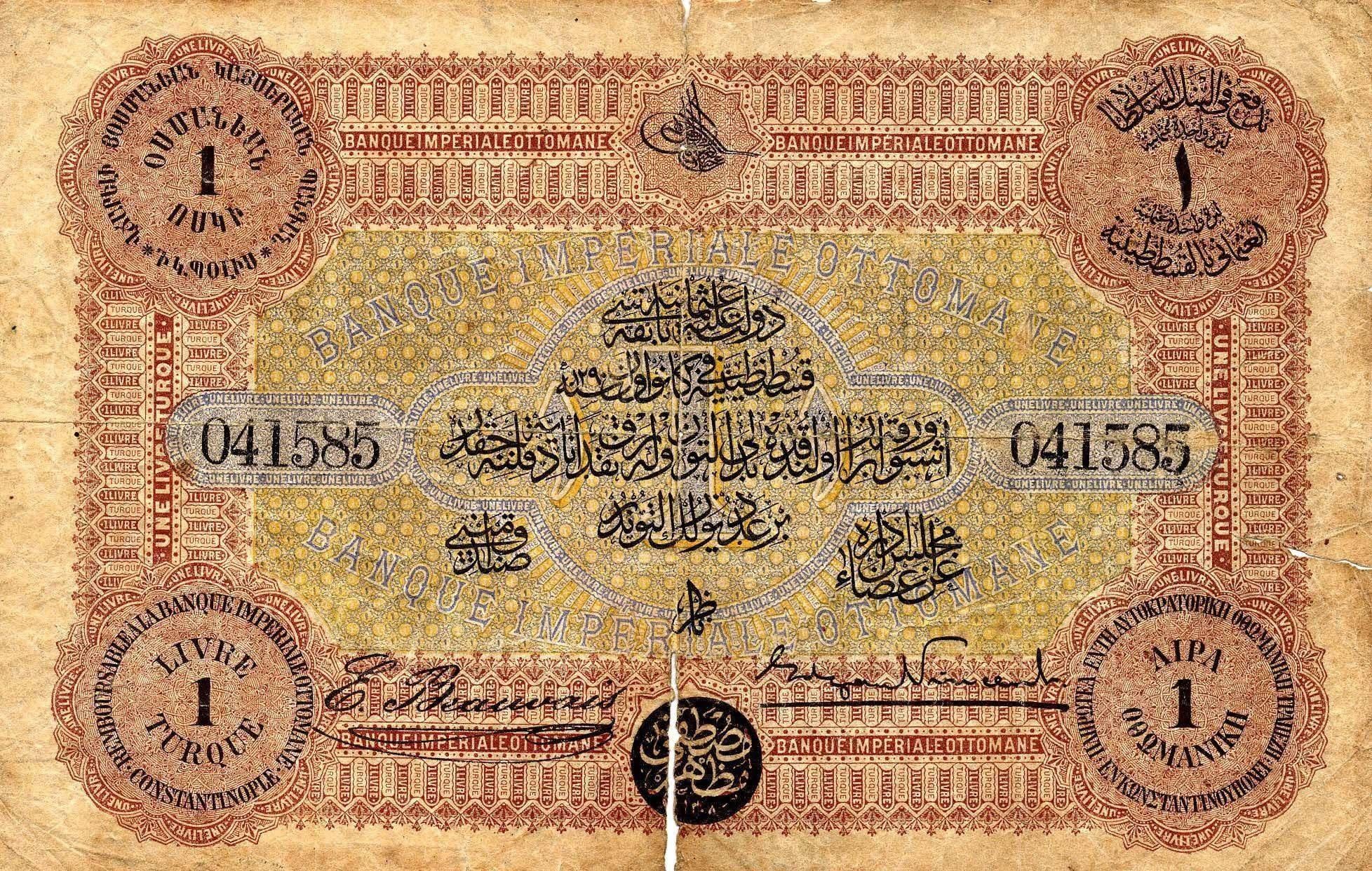 Eine osmanische Lira -Notiz vom 1875. Es enthält Text in Griechisch, Persisch, Türkisch, Französisch, Armenisch und Arabisch. Das Kapital wird als Konstantinopel bezeichnet.