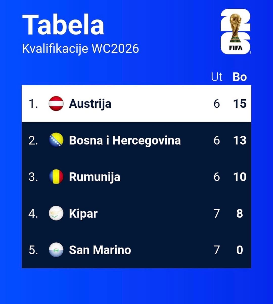 Veceras besiegte Rumänien gegen Österreich mit 1:0 und BiH hat nun eine Chance auf den ersten Platz, aber auch damit wir das dritte Sperrfeuer beenden. Die „Alles-oder-Nichts“-Situation würde für uns, wenn sie gegen die Rumänen ungelöst wäre, ein Hindernis darstellen