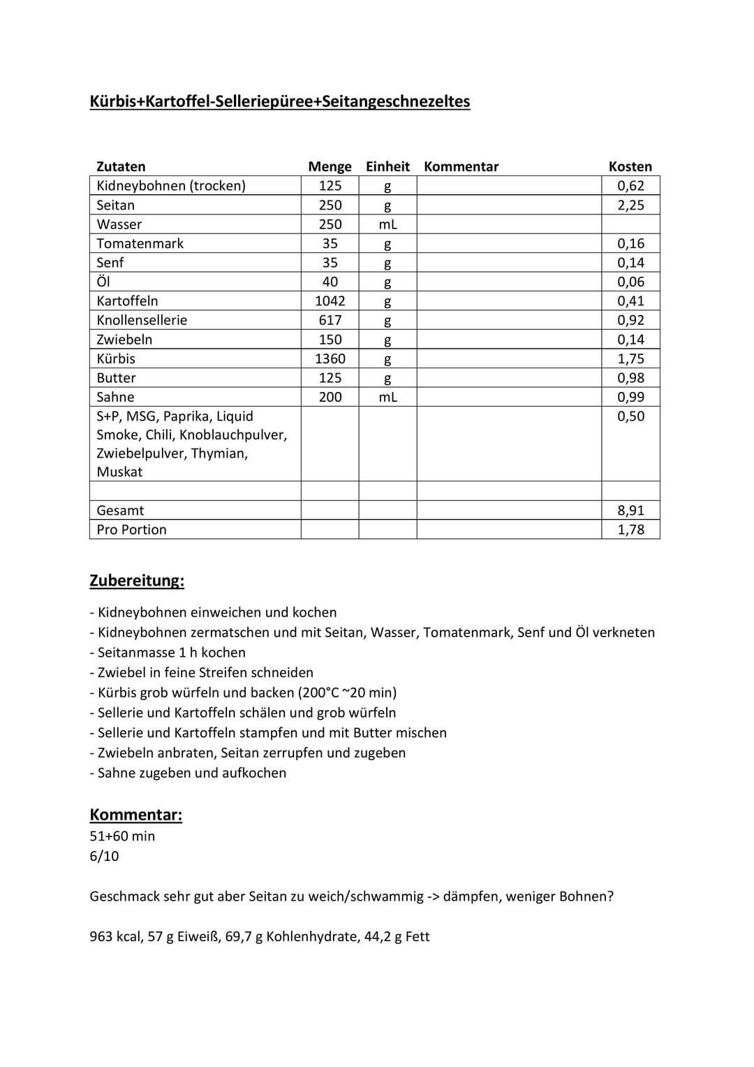 – Kidneybohnen zermatschen und mit Seitan(250 g), Wasser(250 mL), Tomatenmark(35 g), Senf(35 g) und Öl(40 g) verkneten