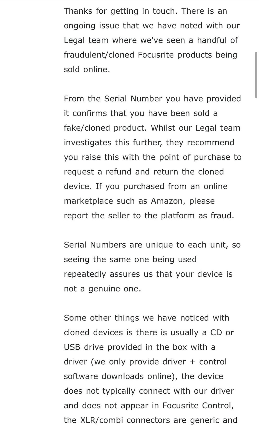 Ich habe dieses Audio-Interface beim Verkäufer ANAVIA auf dem Worte-Marktplatz gekauft und nachdem ich den Focusrite-Support kontaktiert hatte, wurde mir mitgeteilt, dass es sich um ein gefälschtes Produkt handelte. War der Preis zu niedrig? Ja. Aber man weiß nie, wann eine Werbeaktion erscheint, Trumps Zölle und Fortschritte in der künstlichen Intelligenz … Sie wissen nicht, ob es eine gibt, ich habe bereits den Verkäufer und Worten kontaktiert, aber ich weiß nicht, ob es etwas bringt. Sie sagen, der Verkäufer habe 48 Stunden Zeit, um zu antworten, aber sie sagen nicht, was passiert, wenn er nicht antwortet. Der Chat existiert nicht mehr und Sie müssen uns per Telefon kontaktieren, was ich einige Male getan habe, aber keine zufriedenstellende Antwort erhalten habe.