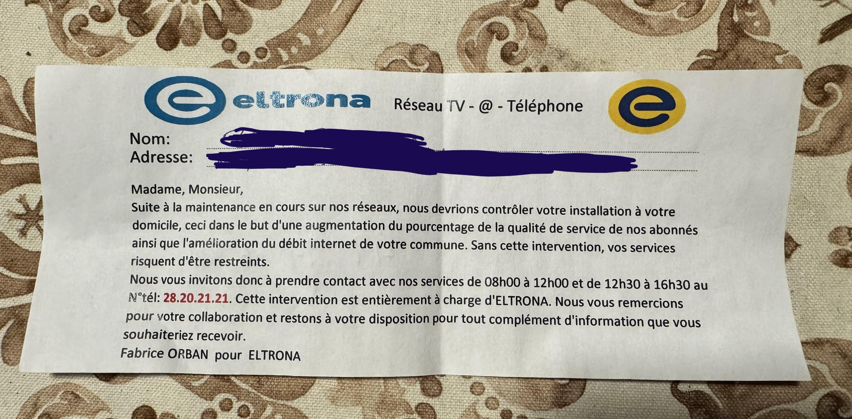 Darin heißt es, dass die Installation bei Ihnen zu Hause wegen Wartungsarbeiten überprüft werden muss, und fordert Sie auf, die Nummer 28.20.21.21 anzurufen. Das Logo wirkt gestreckt und von schlechter Qualität, das Layout ist unordentlich und die Telefonnummer stimmt nicht mit Eltronas tatsächlichem Kontakt überein, nämlich +352 49 94 66 888.