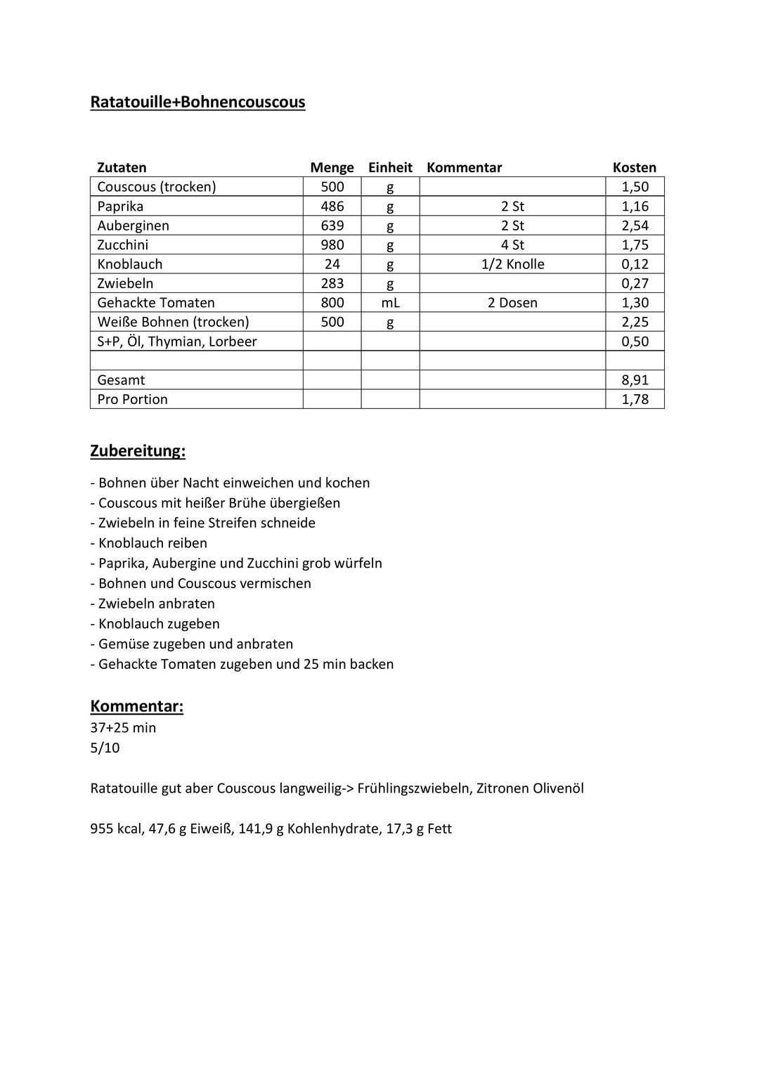 Bin diese Woche nicht so super zufrieden, aber ich wusste nicht was zu Ratatouille passt. Der Couscous passte ganz gut, aber das ein oder andere Gewürz hätte nicht geschadet.