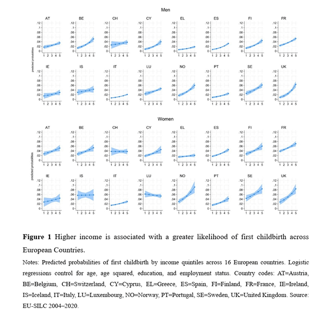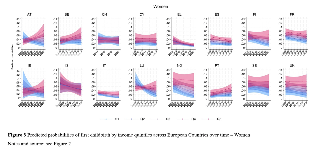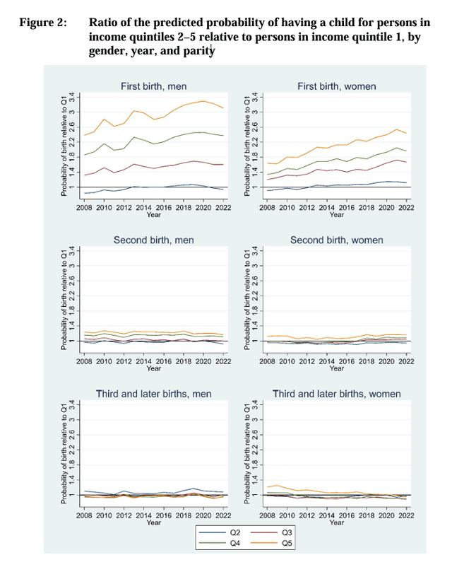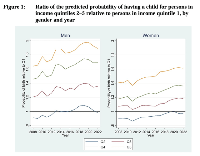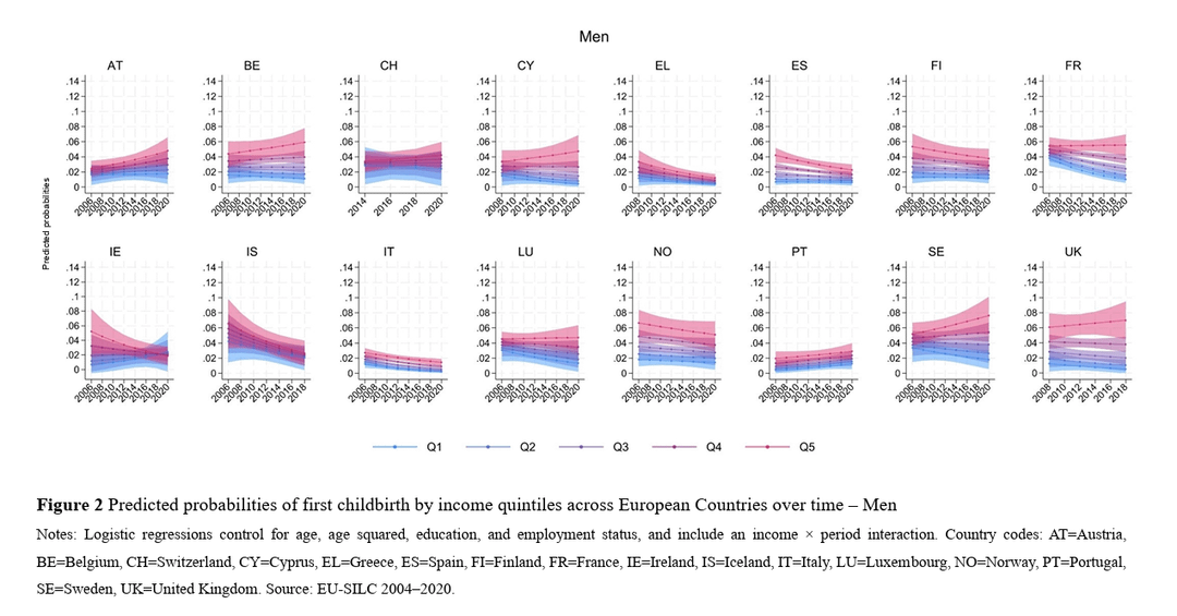 Wie in den Papieren von beschrieben Universität Florenz e Niederländisches Institut für DemographieZum ersten Mal in der jüngeren Geschichte ist die Wahrscheinlichkeit, dass die obersten Quintile der Bevölkerung (oberste 40–20 % und oberste 20–0 % nach Einkommen) ihr erstes Kind bekommen, höher. Dies gilt umso mehr für Männer, bei denen das Vermögen ein noch entscheidenderer Faktor ist als für Frauen, bei denen die Variabilität geringer ist (1. Bild).