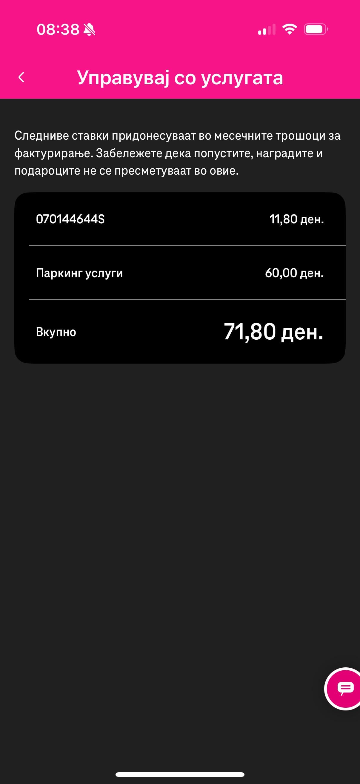 овој е нешто ново – 100% префлен трошак од Паркинг, на А1 гледам наплатени 2 смс поруке 11.8 + 30 за 1ч, порано беше 35,42 за 1ч.. ситно ама ќути си