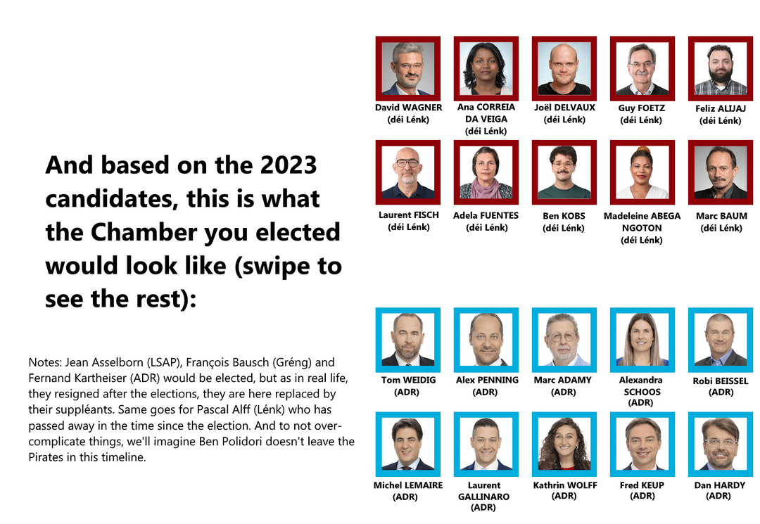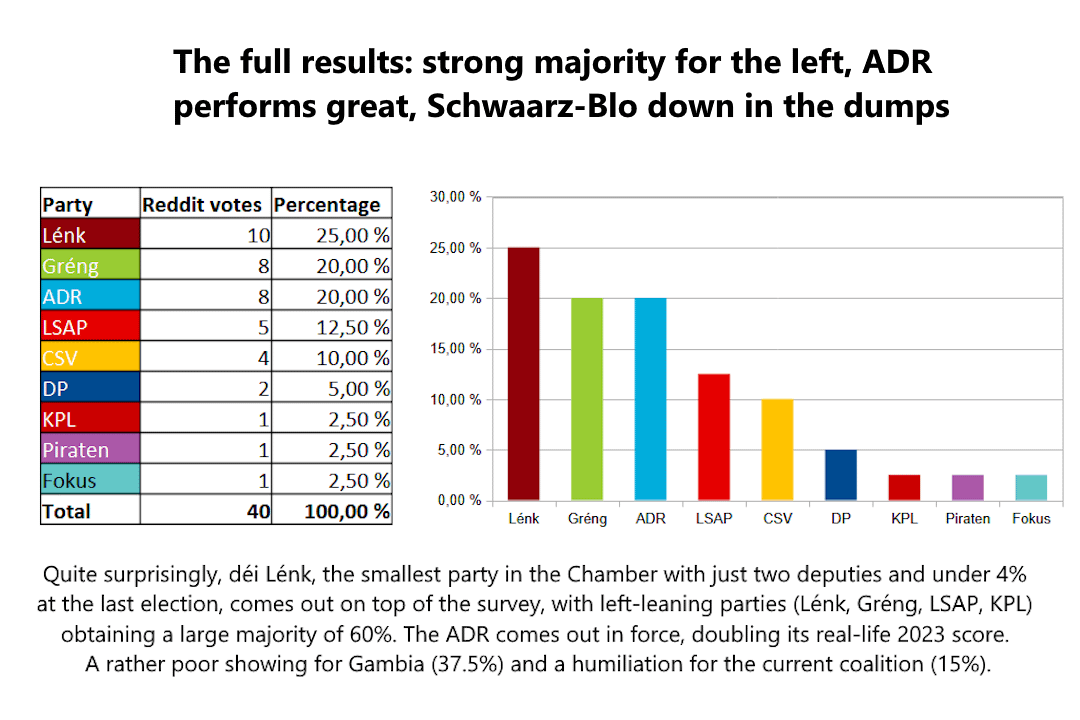 1. Et erstaunt mech schon sou bei de Walen dat sou vill Leit op vermeintlech einfach Léisungen vun der ADR ranfaalen. Op Reddit eigentlech nach méi. En plus, no all de Geschichten déi déi Partei bis elo ugesammelt huet, Civitas Affaire, Like zu der Ausläschung vun LGBTQ, Nazi Fans op de Lëschten, Opruff dat lénk Politiker sollen erstach ginn…asw.