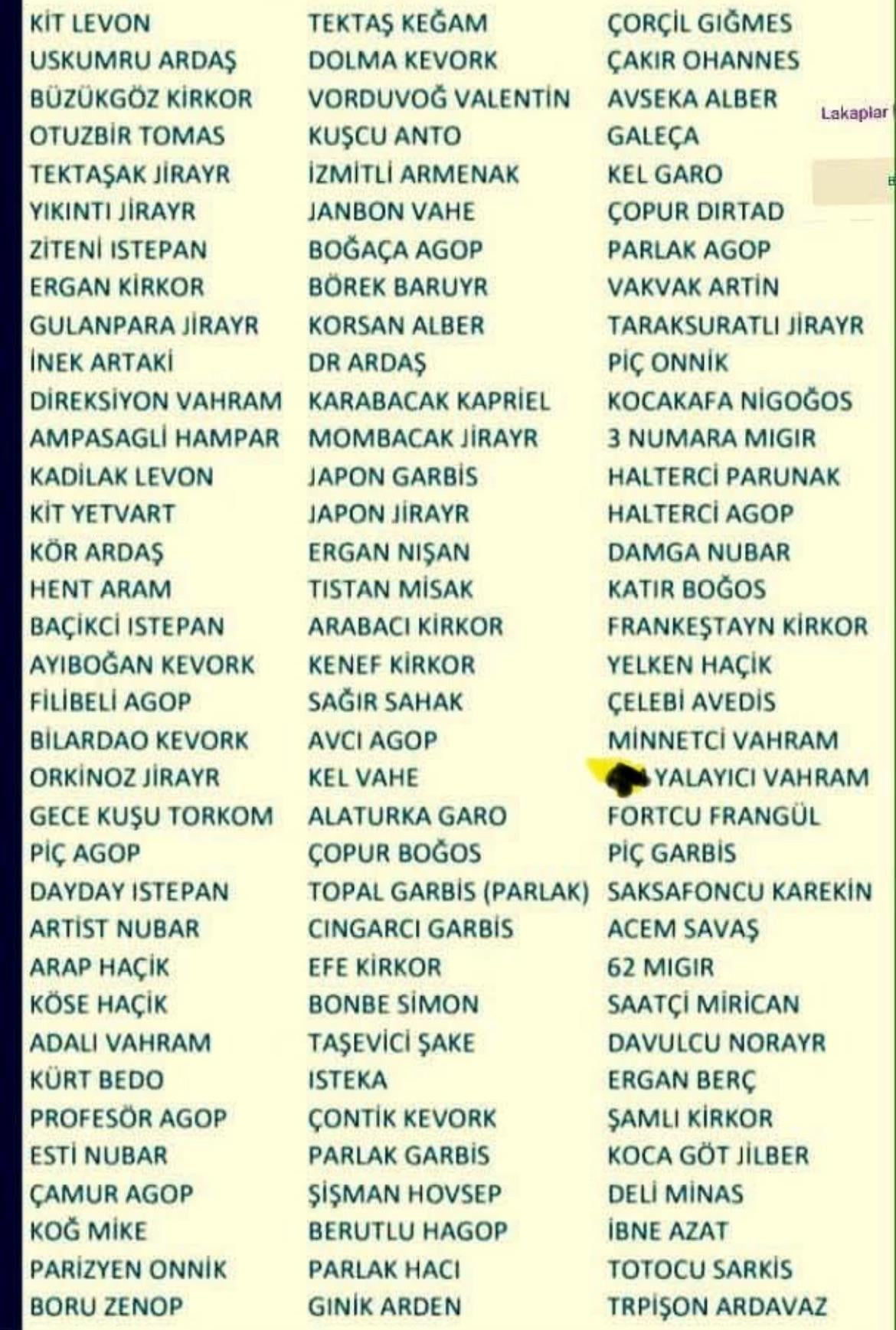 Fast alle Namen sind armenisch, davor stehen türkische Spitznamen. Einige sind wirklich lustig. Es gibt Dinge wie Night Owl, Fat, Big Head und Artist.