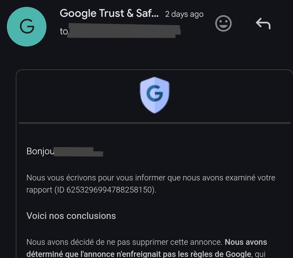 Ich habe versucht, es zu melden, aber Google sagt, dass es für sie gut aussieht …