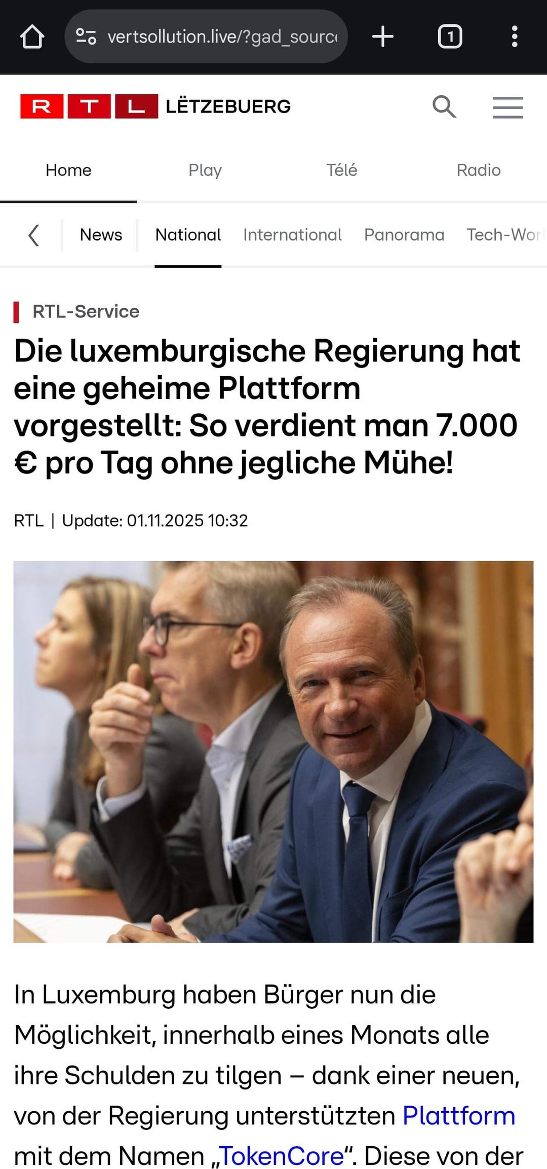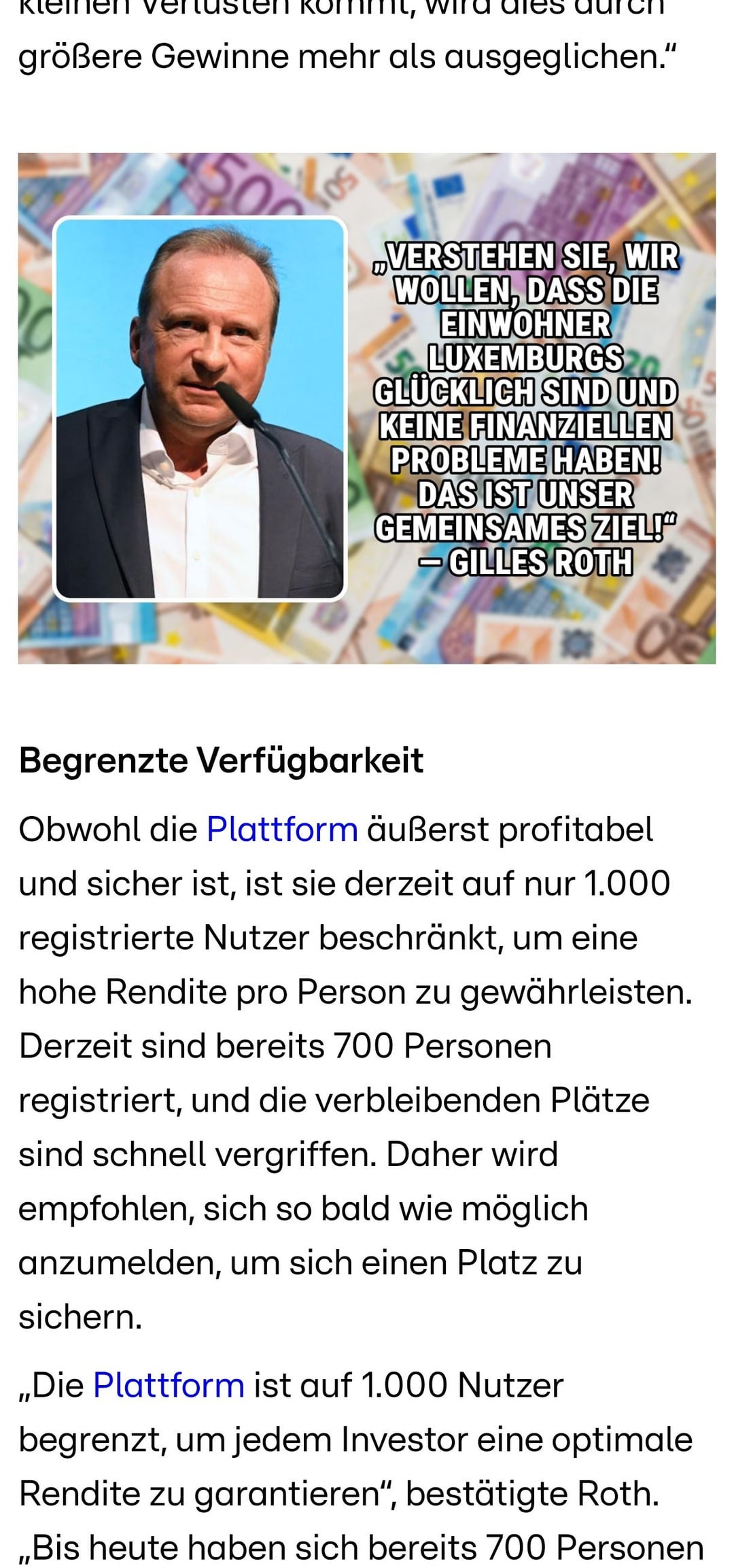 Hat sonst noch jemand diese Anzeigen auf YouTube? Sie behaupten, dass die Regierung (unter Verwendung des Namens und Bildes von Gilles Roth) eine Investitionsplattform ins Leben gerufen hat, die Sie schnell reich machen wird.